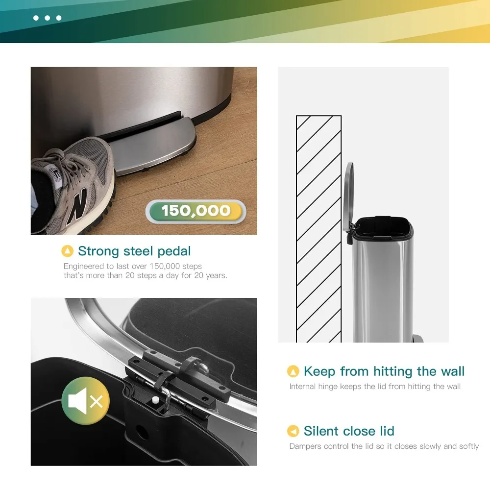- ★『STRONG &FASHIONABLE APPEARANCE』Our kitchen trash can is made of high quality stainless steel with a stainless steel wire drawing surface. The oval body with a sloping lid makes the garbage can look even more cool and beautiful. Buying our stainless steel trash can is a great deal for you.