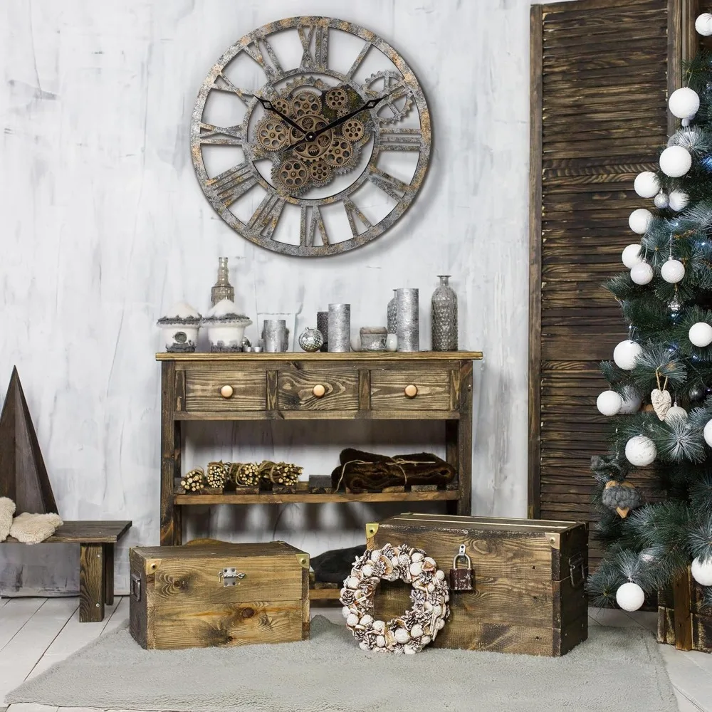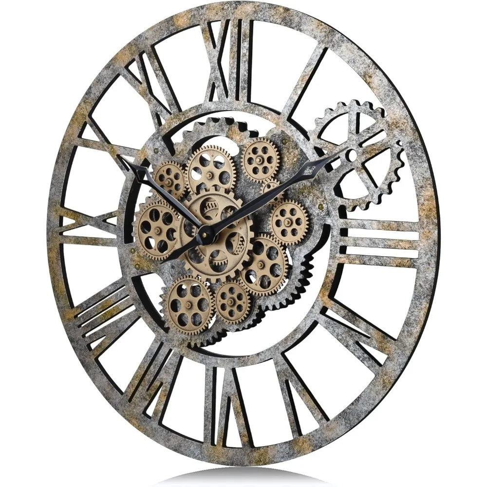 23 Inch Real Moving Gear Wall Clock, Steampunk Wooden Large Wall Clock for Living Room Decor, Farmhouse