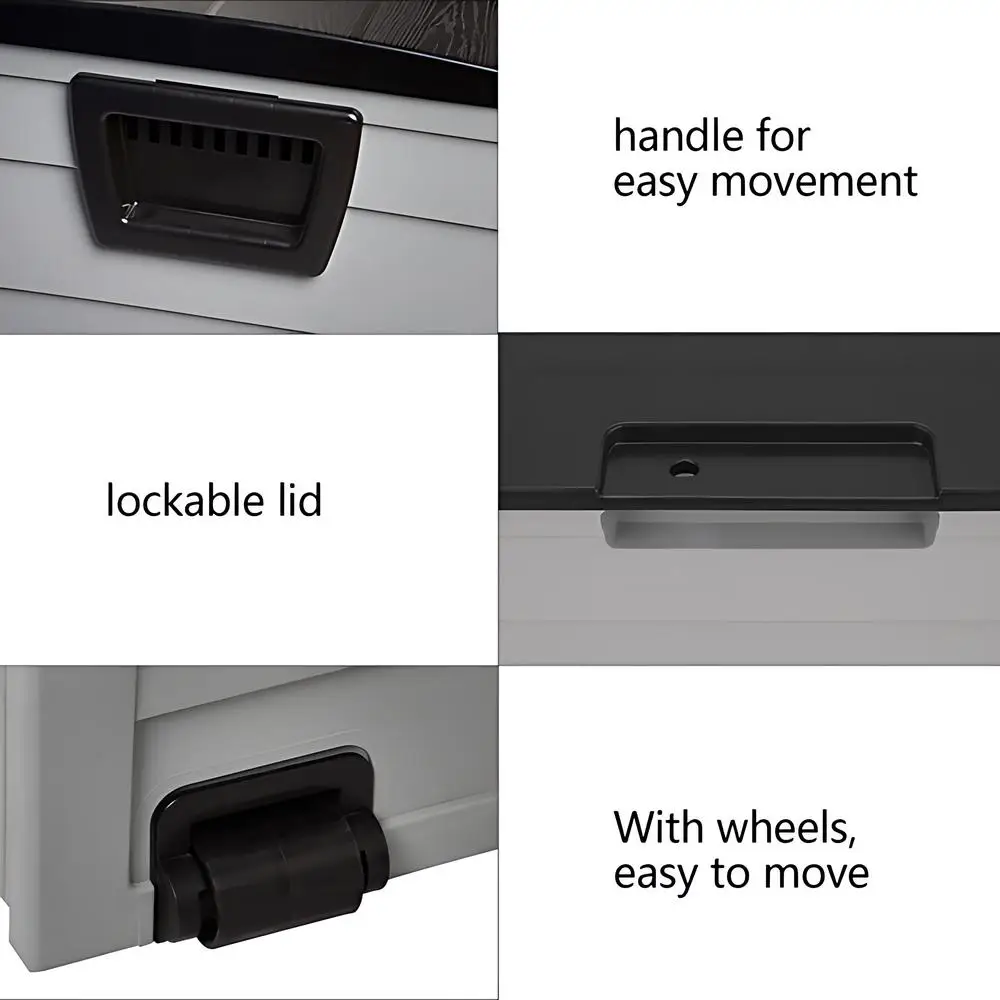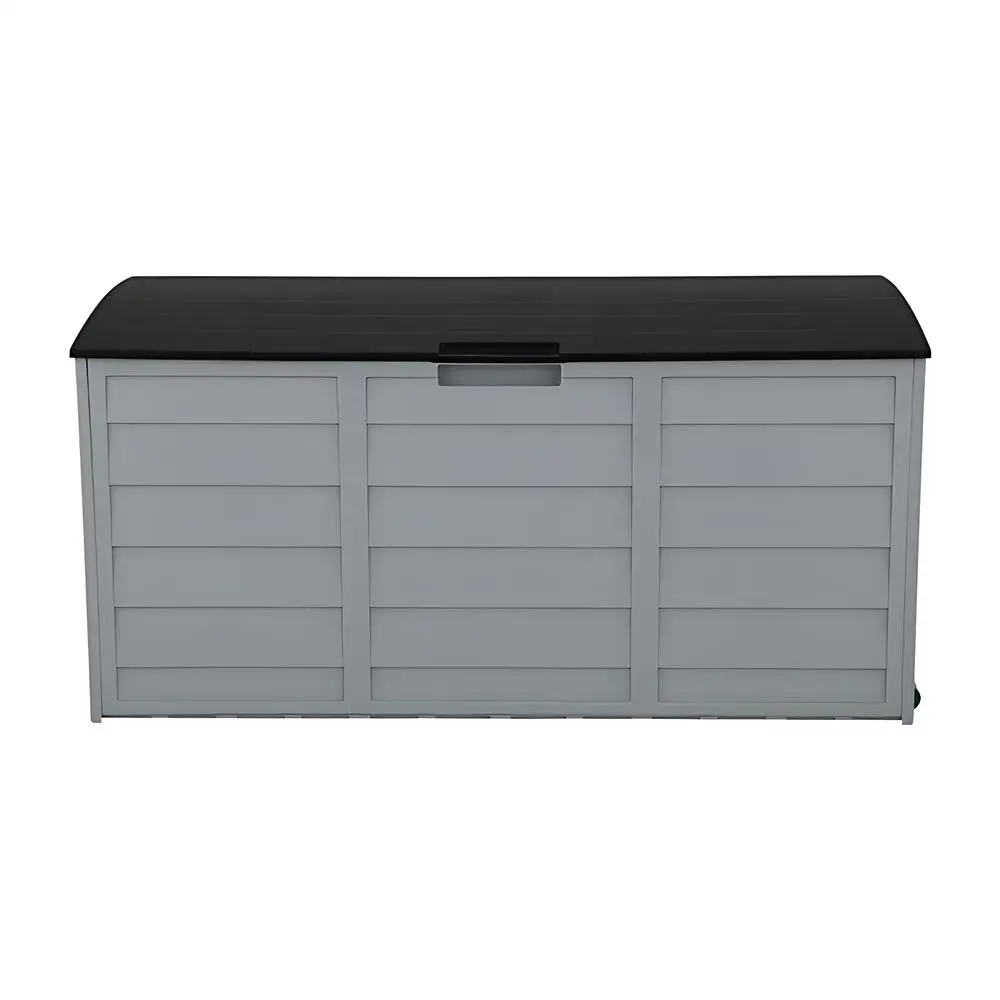 1. 260L Garden Storage Box With Wheels - Formed in hard wearing and durable plastic which is water-resistant, weatherproof, and UV resistant, with a slatted wood-effect finish. Fully sealed design protects against insects and other pests