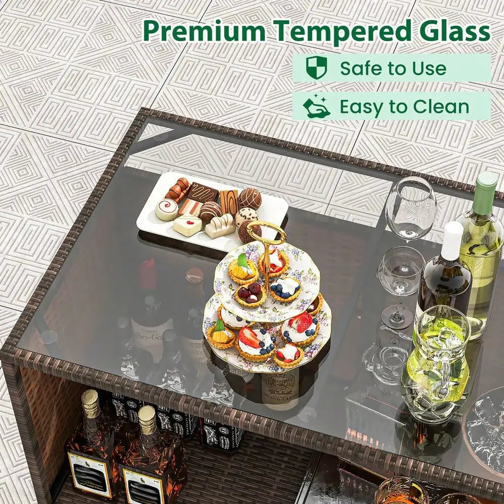 Cheers to comfort, style and endless summer nights with our 3-piece PE rattan patio bar set. Crafted with hand-woven PE wicker and featuring a sleek tempered glass tabletop, this outdoor bar set promises both resilience and a modern aesthetic. Moreover, this patio bar table and chairs set perfectly balances style and functionality, including a 39'' bar table matched ideally with 28'' stools, all enhanced by conveniently placed 12.5'' and 11'' footrests for peak comfort. Built-in storage shelves under the table ensure essentials are within easy reach, while removable cushions on each stool promise easy maintenance and cozy seating.