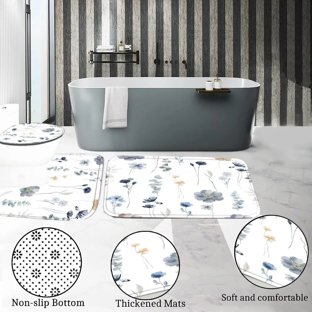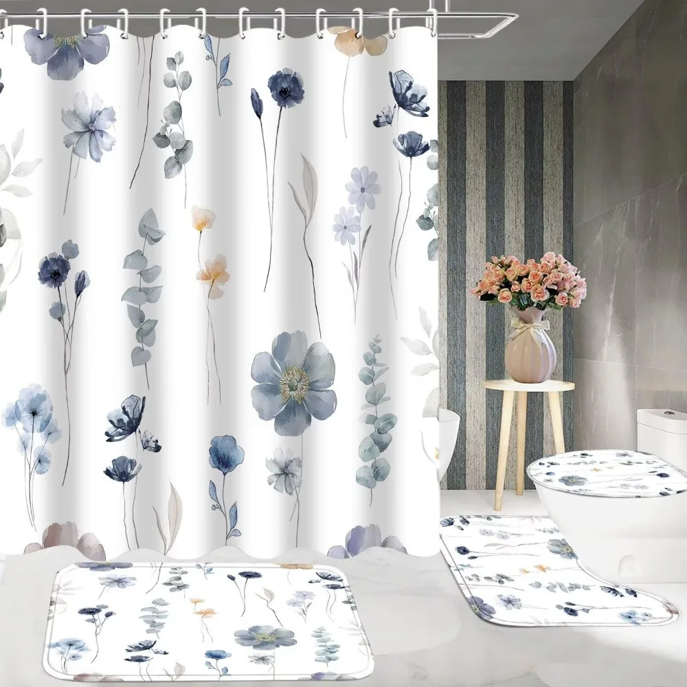 4pcs watercolor flower shower curtain set with non-slip rugs, toilet lid cover and bath mat, modern minimalist floral shower curtain