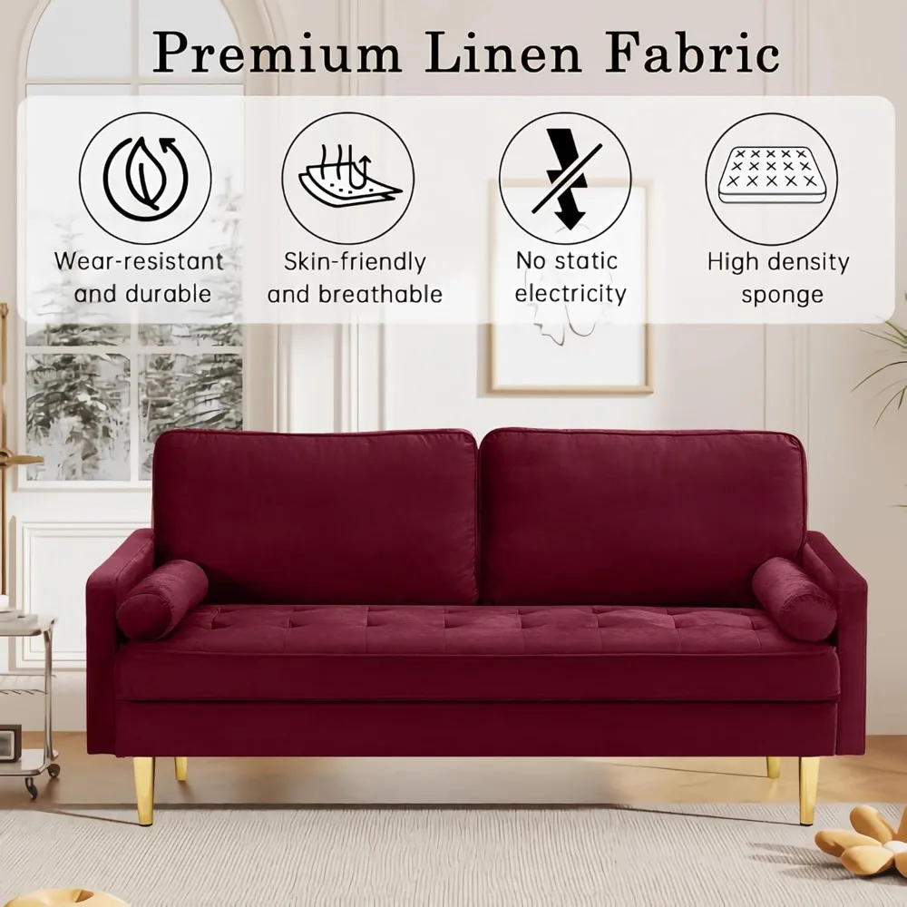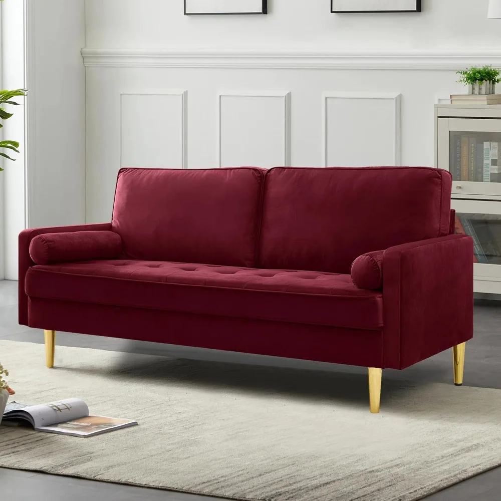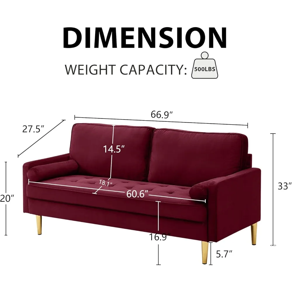 67" Modern Velvet Loveseat Sofa Couch, Mid-Century Tufted Upholstered Small Love Seat Couch with 2 Pillows & 4 Golden Legs (Multiple colors)