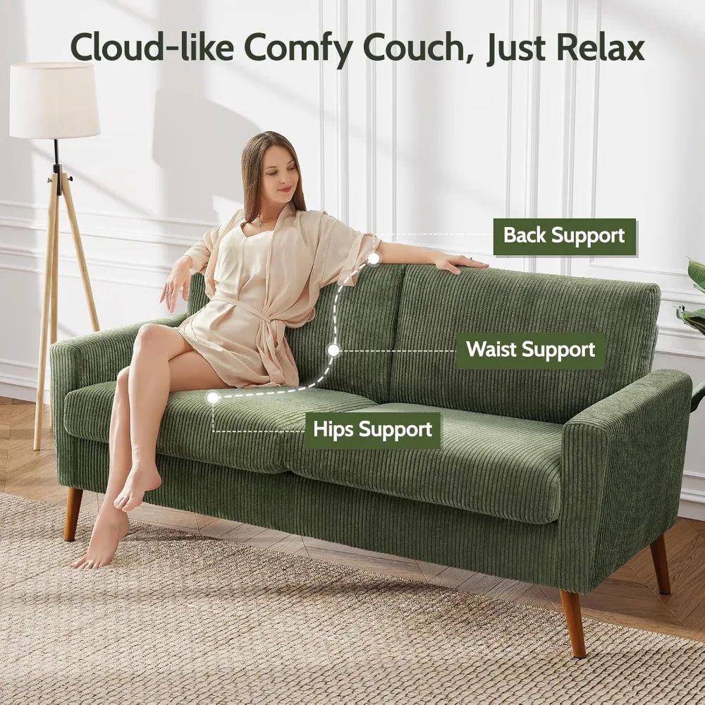 68" Loveseat Sofa Green Corduroy Couch, Mid Century Modern Love Seat Couches for Living Room, Small Loveseat for Bedroom