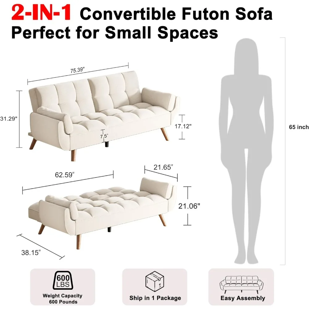 75.4" Futon Couch, Convertible Loveseat Sleeper Couch with Adjustable Backrest for Small Spaces (Multiple colors)
