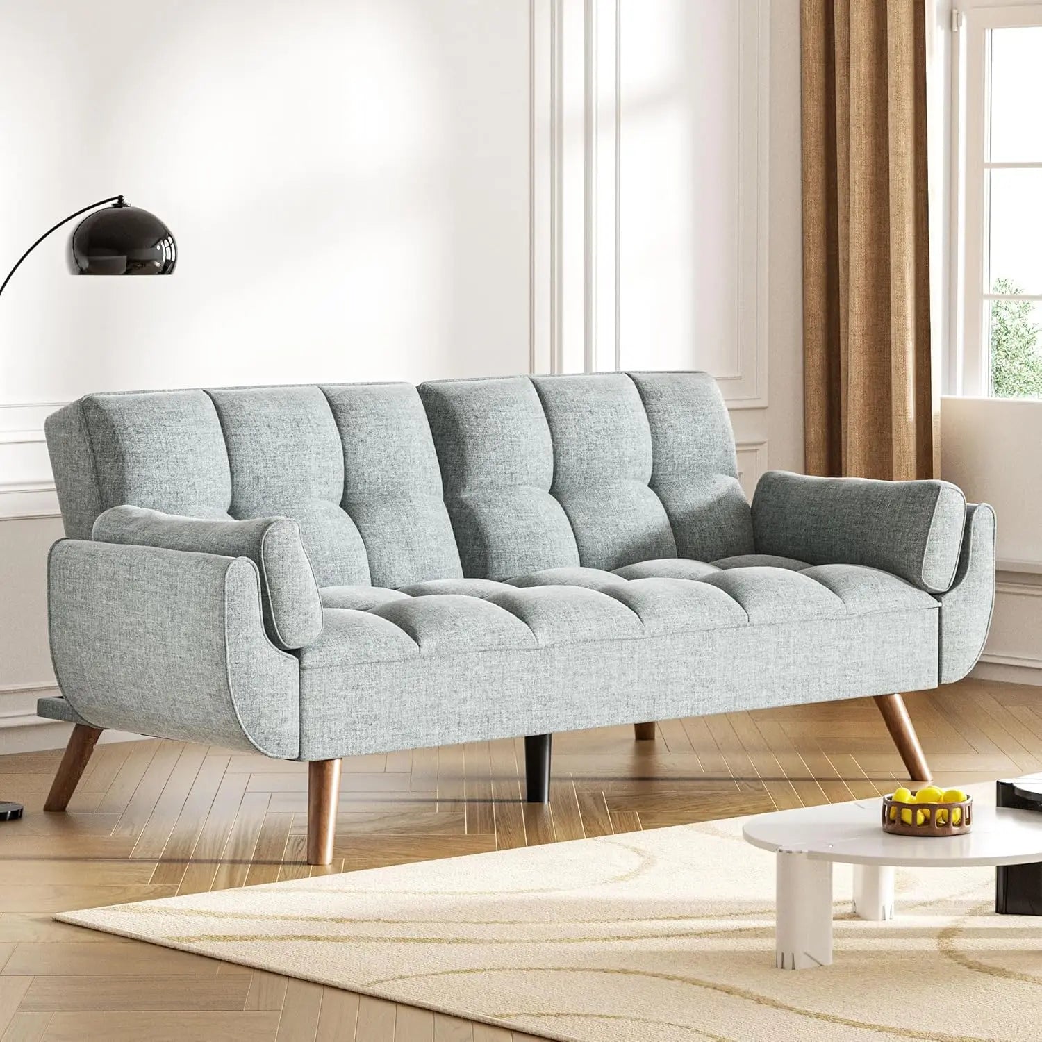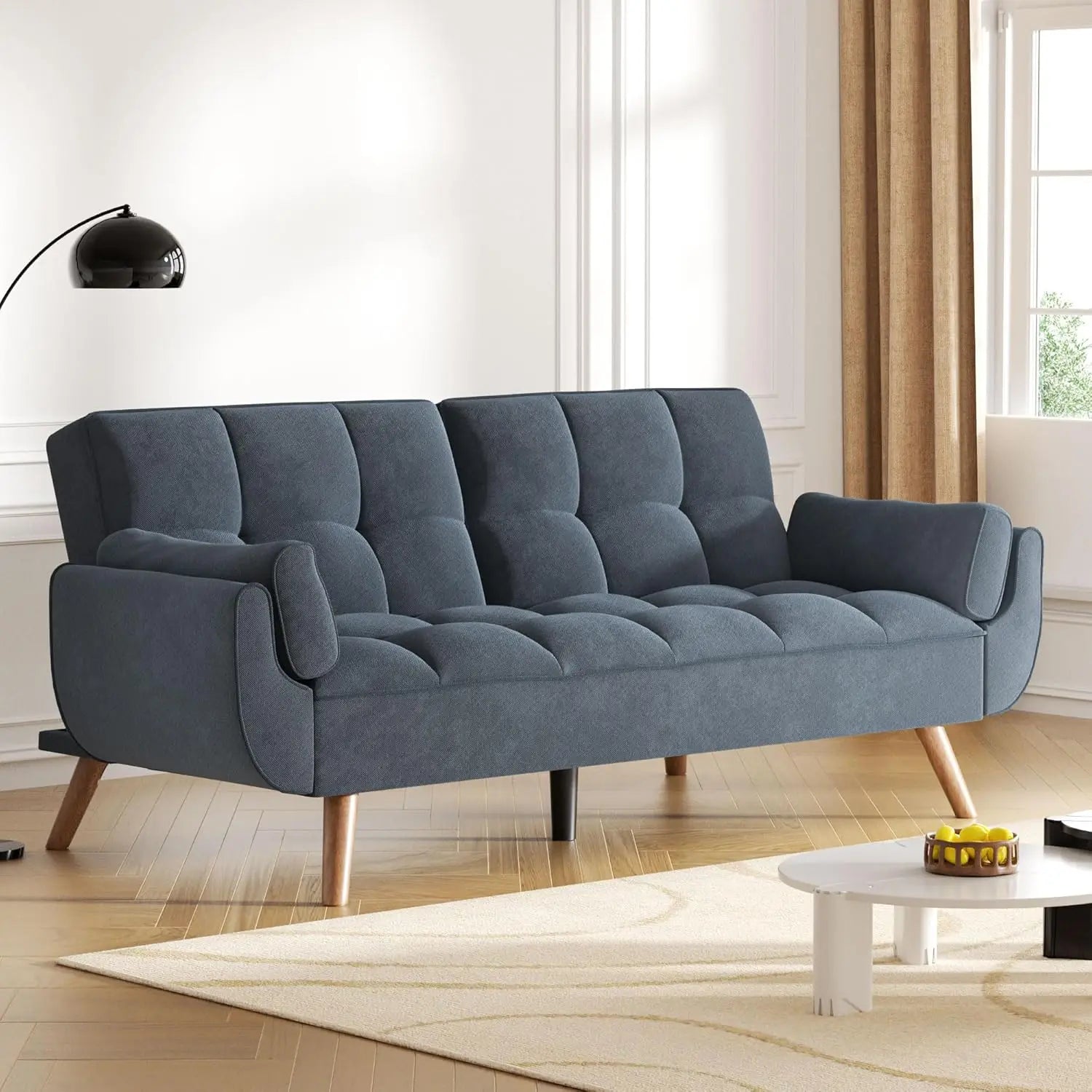 - BUILT TO LAST WITH SMART, MODERN TOUCHES Crafted with a sturdy frame and wrapped in a soft, breathable fabric, this futon sofa bed provides reliable support that stands the test of time. The cushions are firm and resilient for long-term durability. As a bonus, the slim, elevated legs are tall enough for most robot vacuums to pass underneath, making cleanup a breeze.