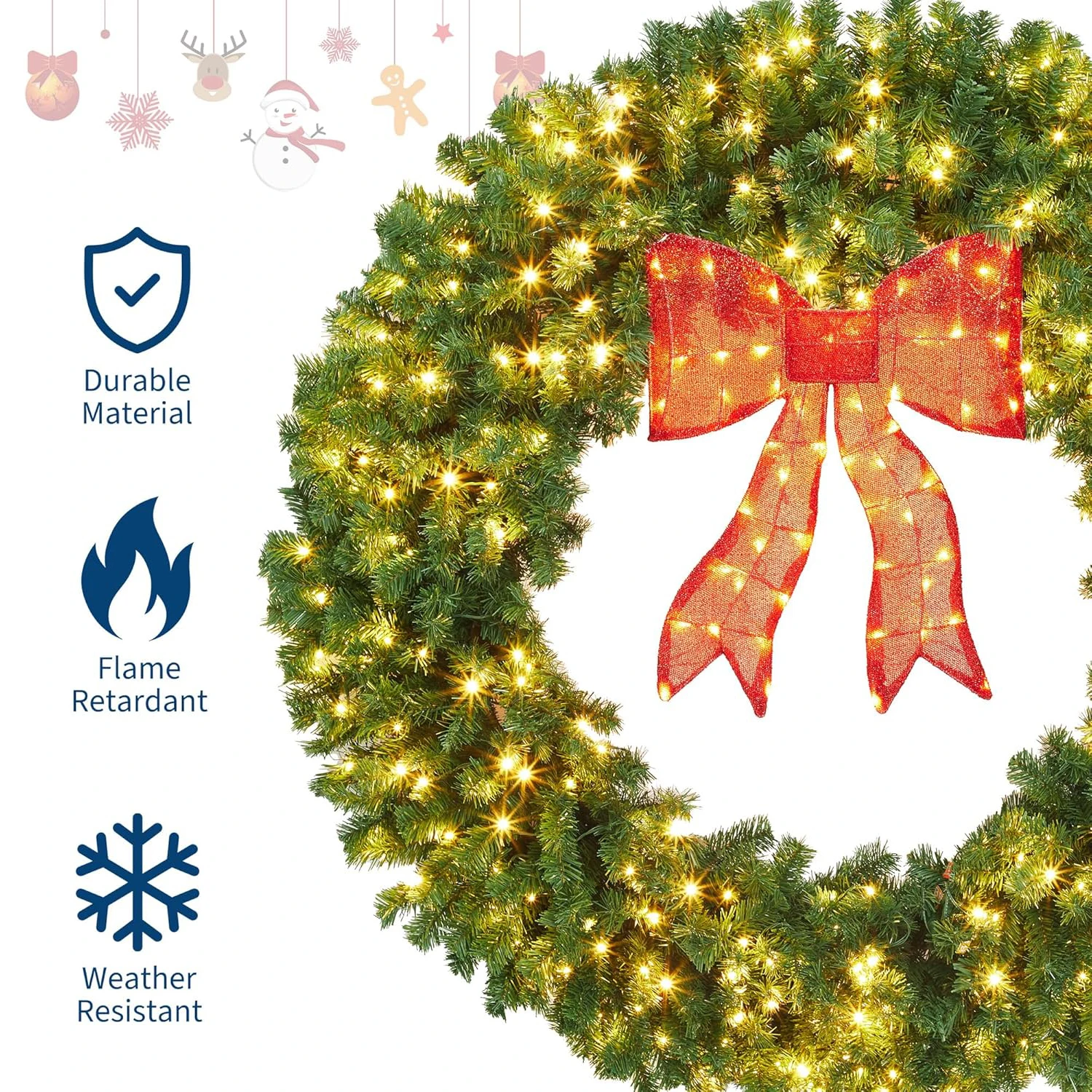 🎄【Durable Material】This Christmas wreath is made of high-quality materials and hypoallergenic fireproof needles to ensure long-term use of LED lights.