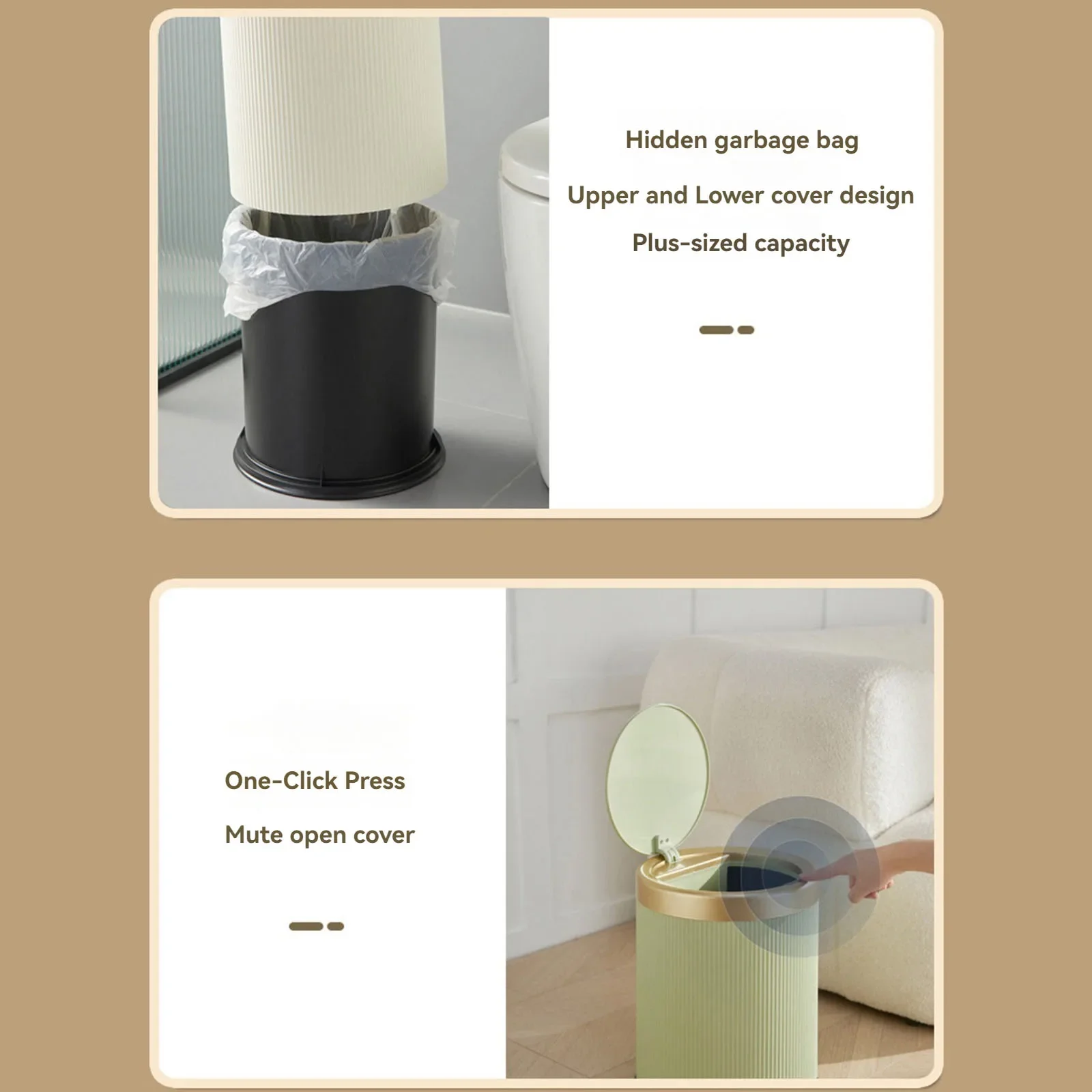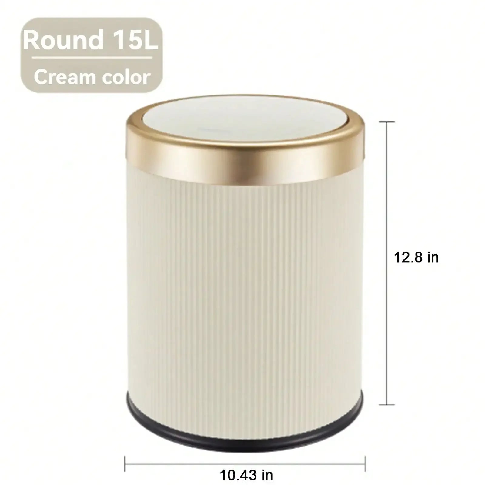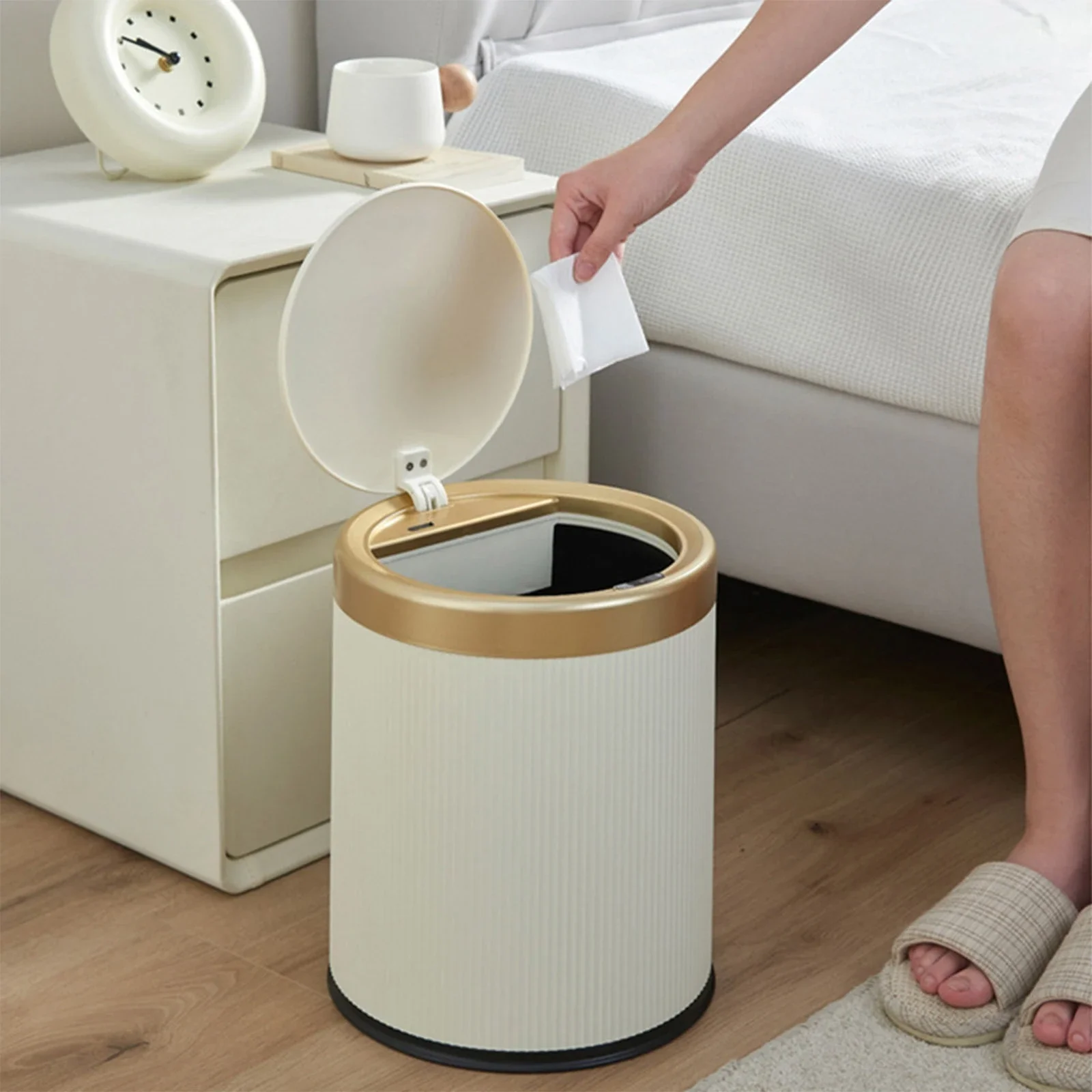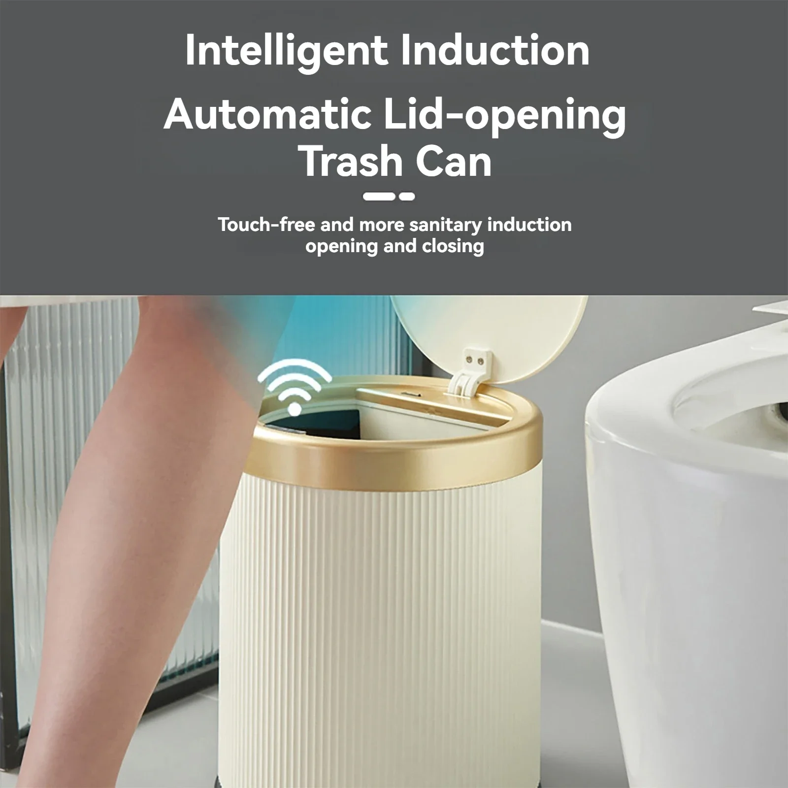Decorative Trash Can:This round automatic trash can with a gold rim has a plastic lined bucket that can hide an extra trash bag, which looks clean and elegant. No matter where you put it, it can make your room look more tasteful. "