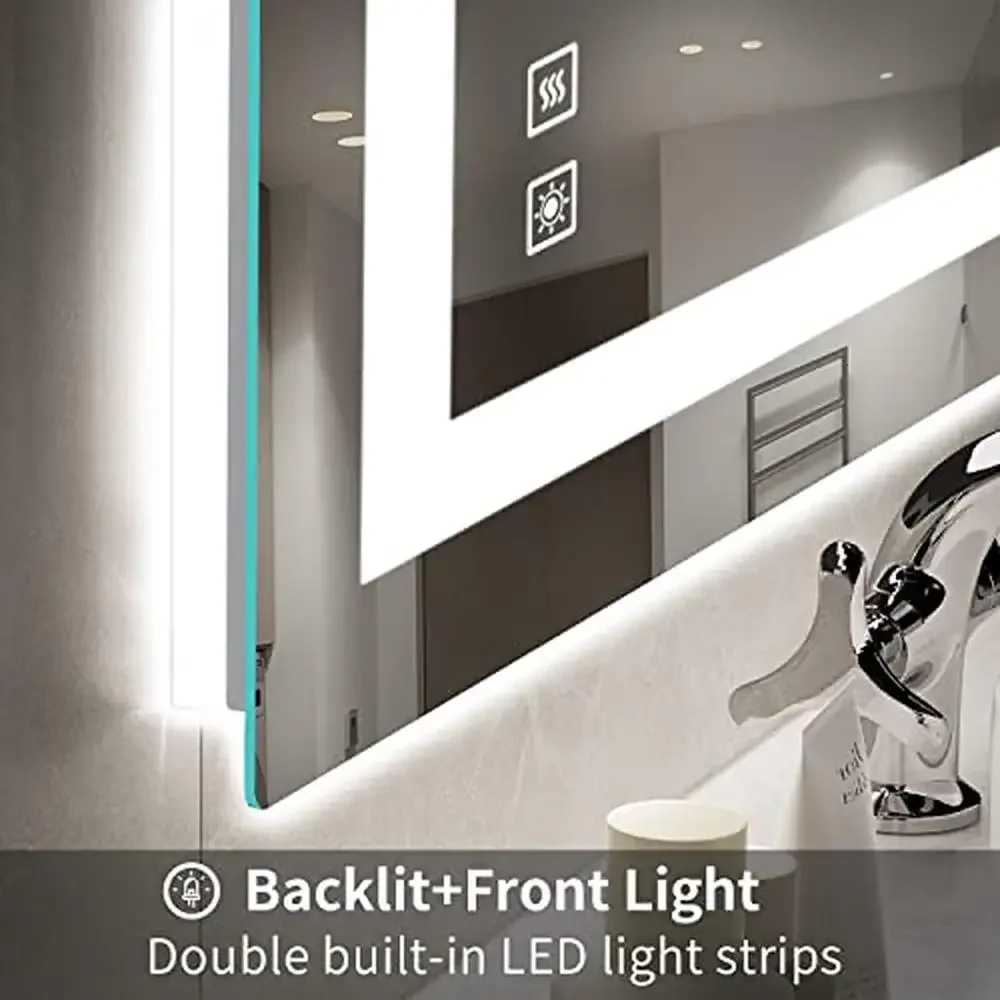 This LED Mirror for the Bathroom is ETL certified, meeting safety standards. The power supply and LED lights are UL listed and have a lifespan of more than 50,000 hours. It features built-in two IP54 waterproof LED light strips that provide both backlit and front light. The mirror is made of 4mm thinner shatter-proof tempered glass, offering high and robust quality with a lighter overall weight compared to ordinary LED mirrors.