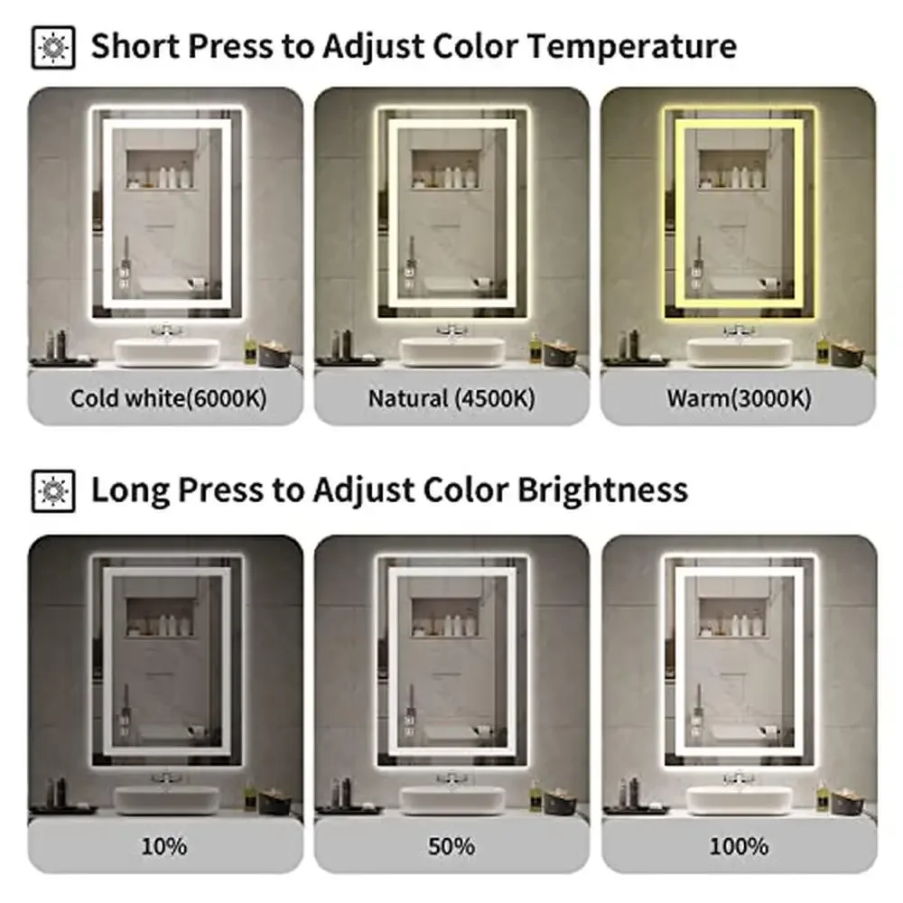 This multi-functional bathroom vanity mirror has 3 color temperature lights: warm(3000K), natural (4500K) and white(6000K). The brightness of the light can be adjusted from 10% to 100% with a touch sensor button on the mirror. The memory function allows the last color temperature and brightness set to be recalled when you turn on the button to avoid the trouble of repeated adjustment.