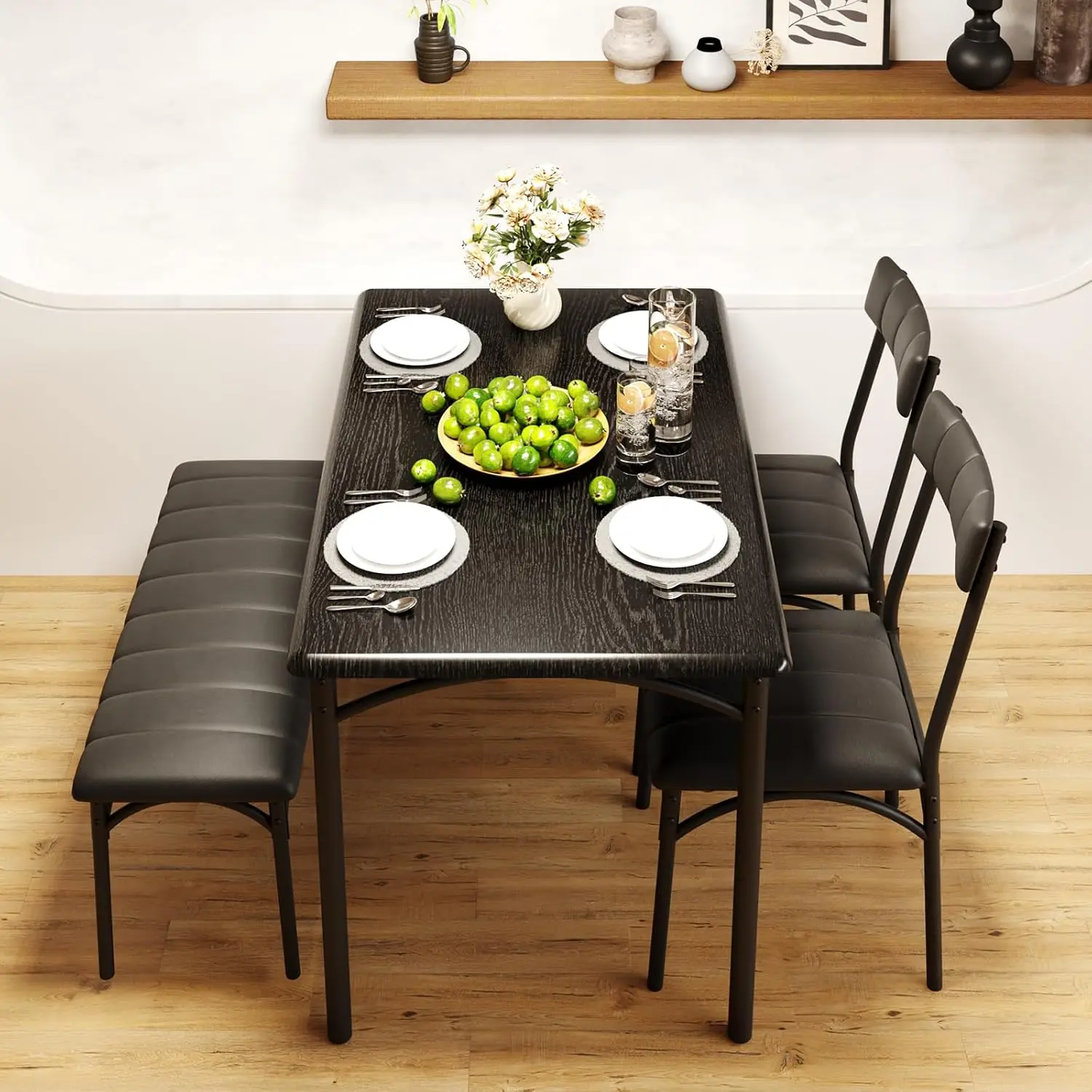 Space-Efficient Design: Optimize your living space with this clever kitchen table chairs set of 4, where the bench and two chairs fit snugly under the table when not in use, keeping your area neat and uncluttered. Ideal for compact spaces such as apartments, kitchens, dining rooms, or studios, this dining table set for 4 lets you enjoy dining without taking up unnecessary room