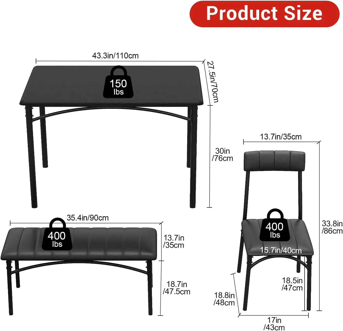 Fast and Simple Assembly: Putting together your new dining table set for 4 is quick and effortless! All necessary tools and hardware are provided, along with easy-to-follow illustrated instructions. You’ll have your rustic kitchen table and chairs assembled and ready to use in less than 40 minutes, making it a convenient and stylish addition to your home. Dimensions: Table: 43.39”L x 27.59”W x 30.09”H; Chair: 18.89”L x 17.09”W x 33.89”H; Bench: 35.49”L x 13.79”W x 18.79”H