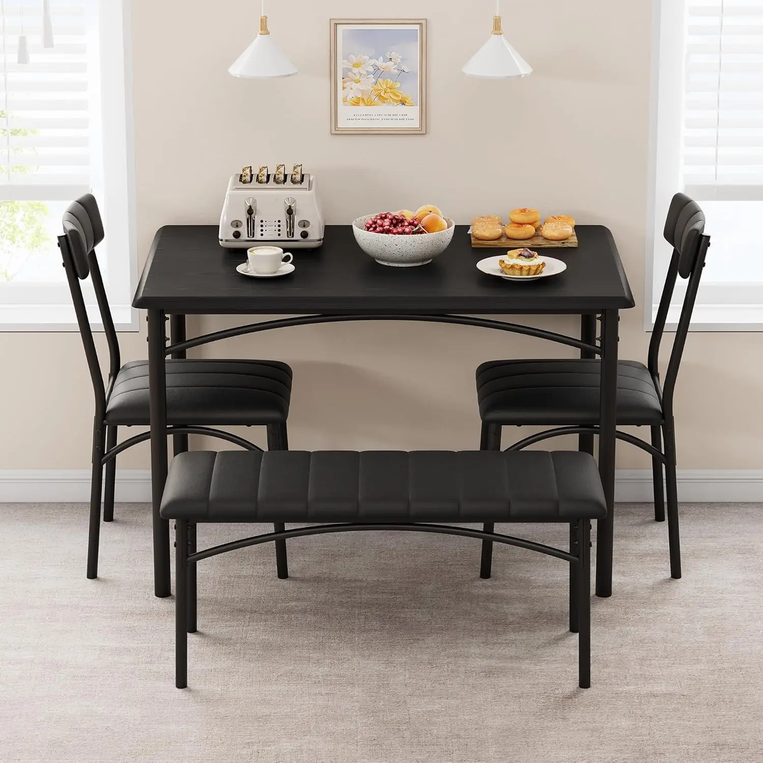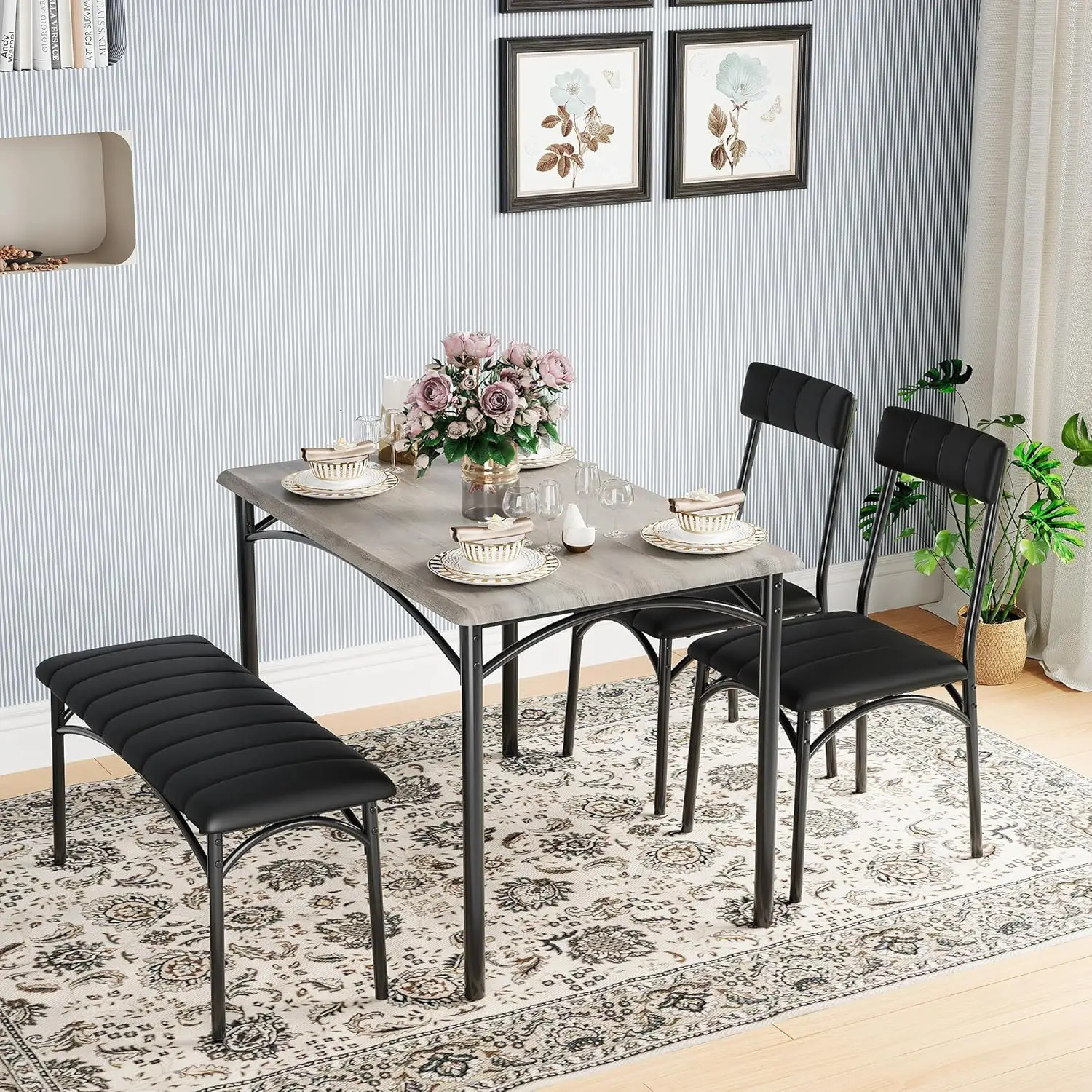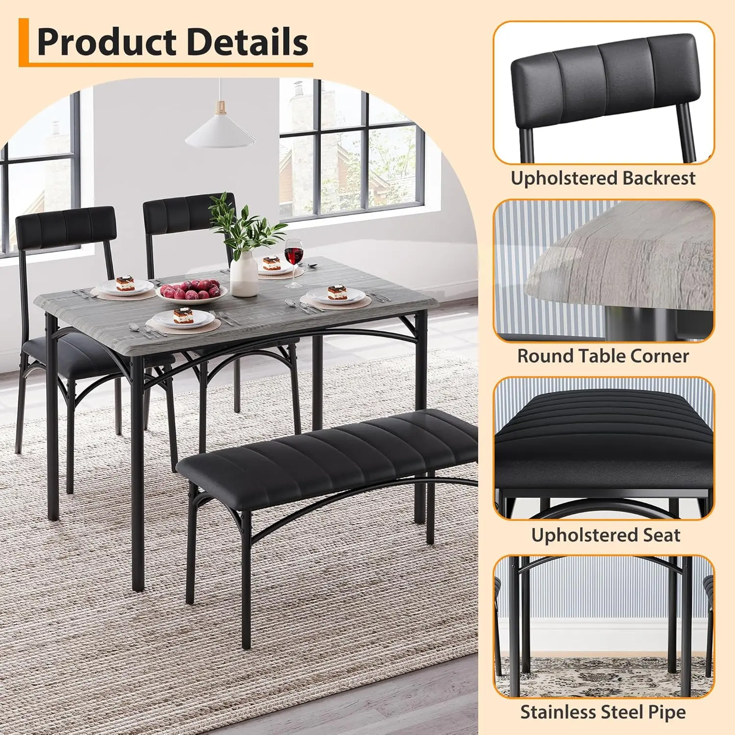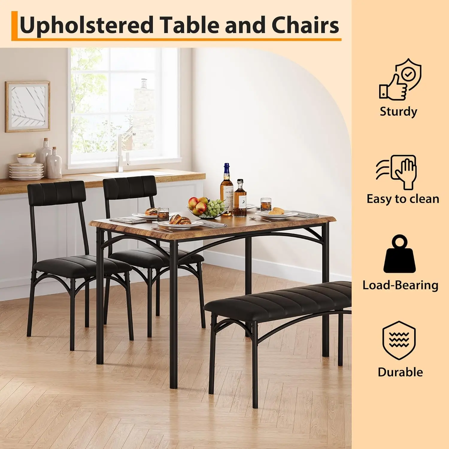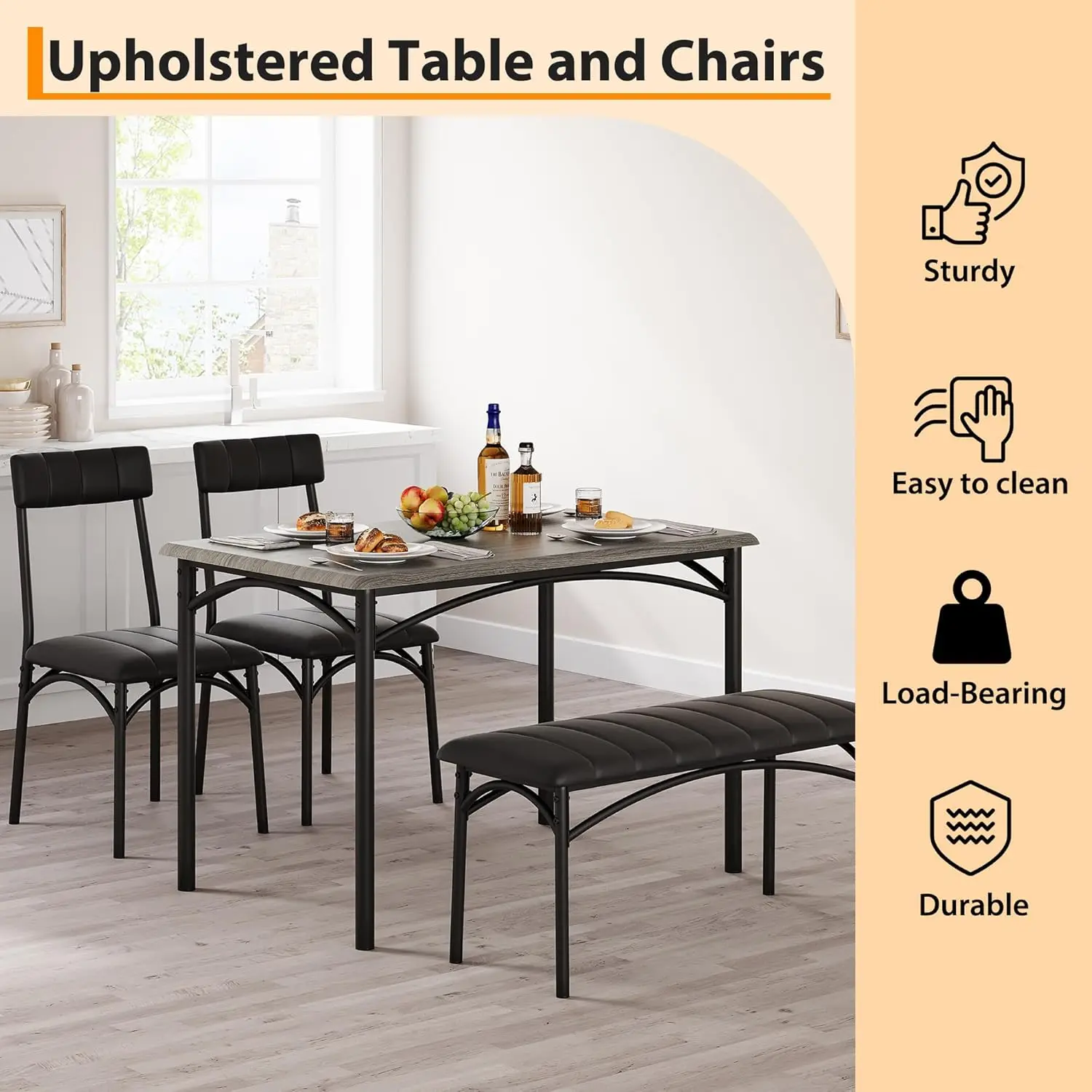 Cozy Upholstered Bench & Chairs: Enjoy superior dining comfort with our luxurious upholstered bench and chair set. Constructed from durable MDF and steel, this dining table set for 4 boasts a strong, long-lasting frame. The extra-thick metal pipes offer improved stability, while the plush cushions on both bench and chairs deliver exceptional comfort—ideal for long, relaxing meals with family and friends