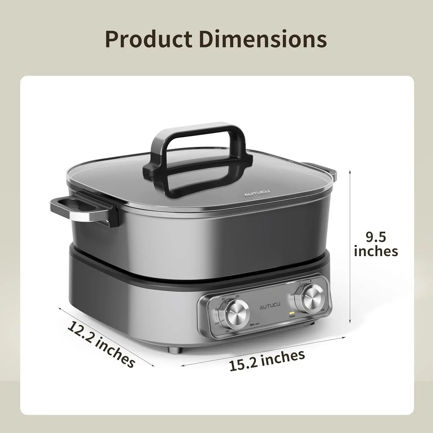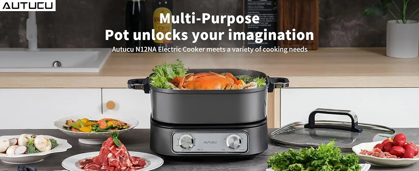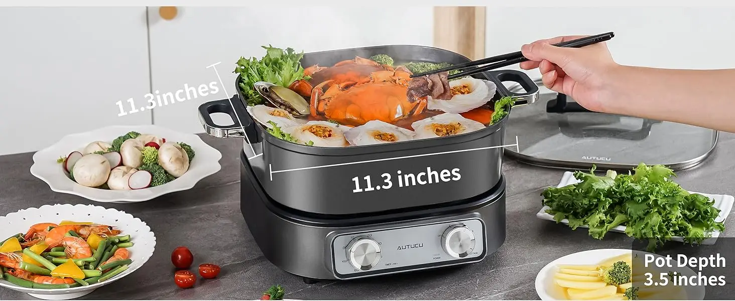 2. 【Dual Knobs For Time and Temperature Control】 The left timer knob precisely controls cooking time and pauses when time is up. The right heat knob adjusts the heat level for different cooking needs. (The Electric Pot serves as a versatile kitchen appliance that can be used as a hot pot, electric soup pot, Electric Skillets, frying pan, soup pot, and more.)