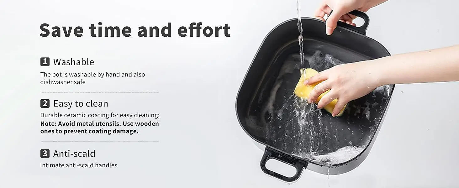3. 【Non-stick PFOA-Free Ceramic-Coated Pot】 This electric hot pot features a Non-stick PFOA-Free Ceramic-Coated on both inner and outer layers, offering excellent food release and easy cleaning. To maintain the coating's durability, please avoid using metal utensils.