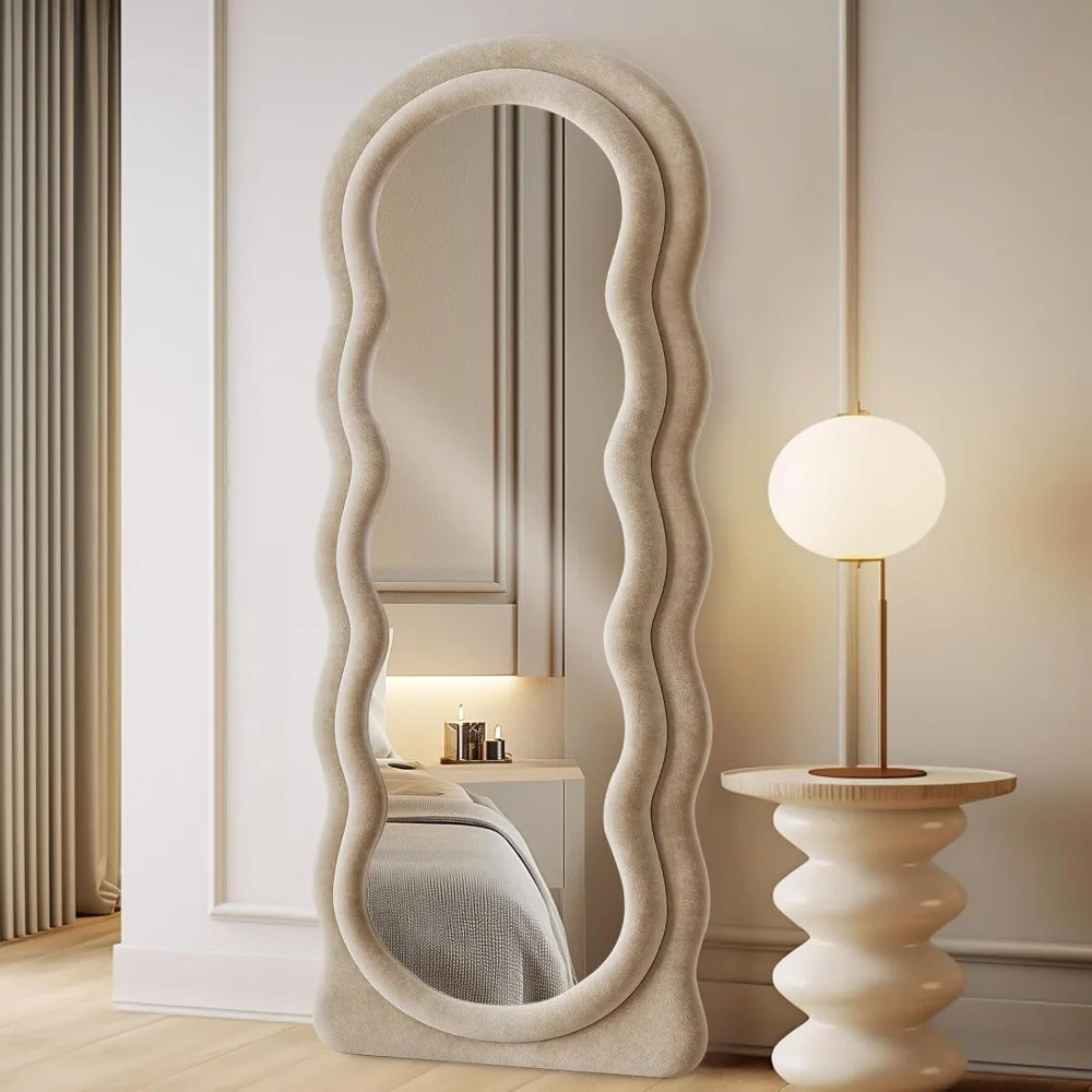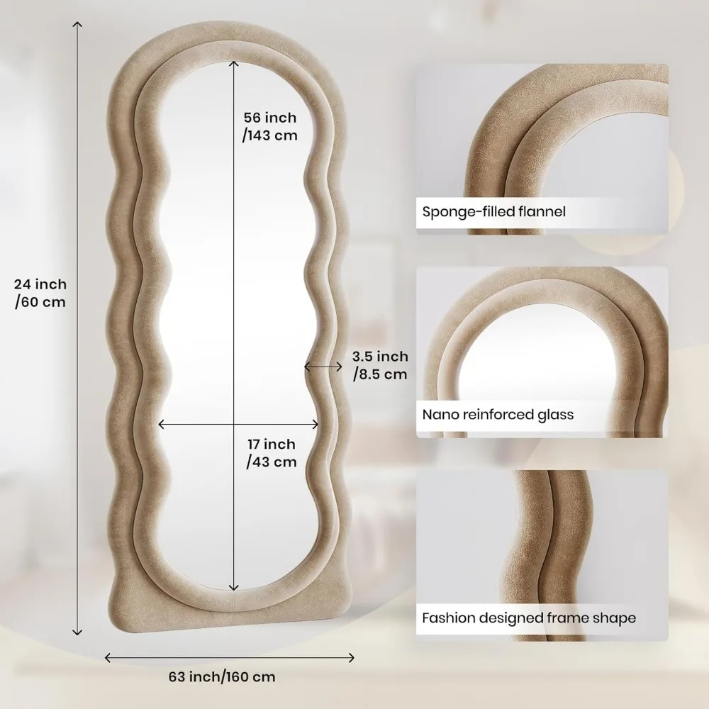 Full Length Mirror 63"x24" Arched Wavy Full Body Wall Mounted Floor Mirror with Stand Milk Tea Flannel Frame Leaning Hanging