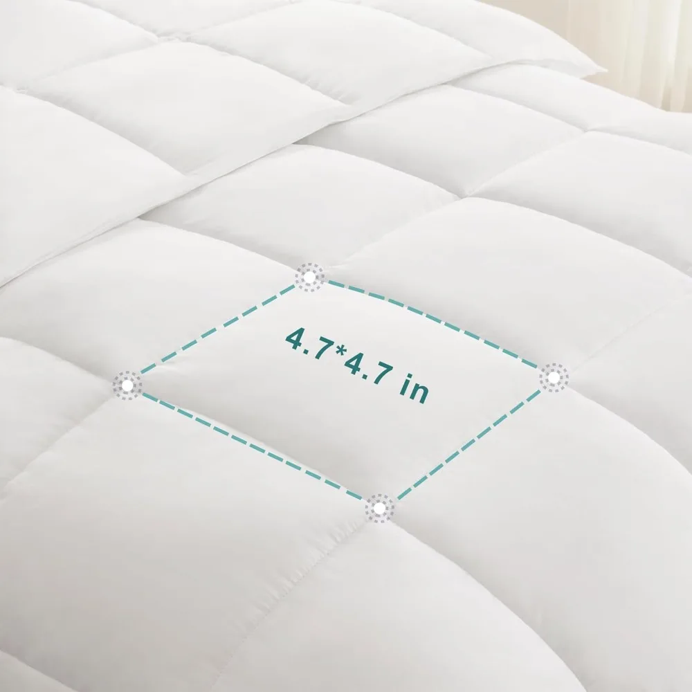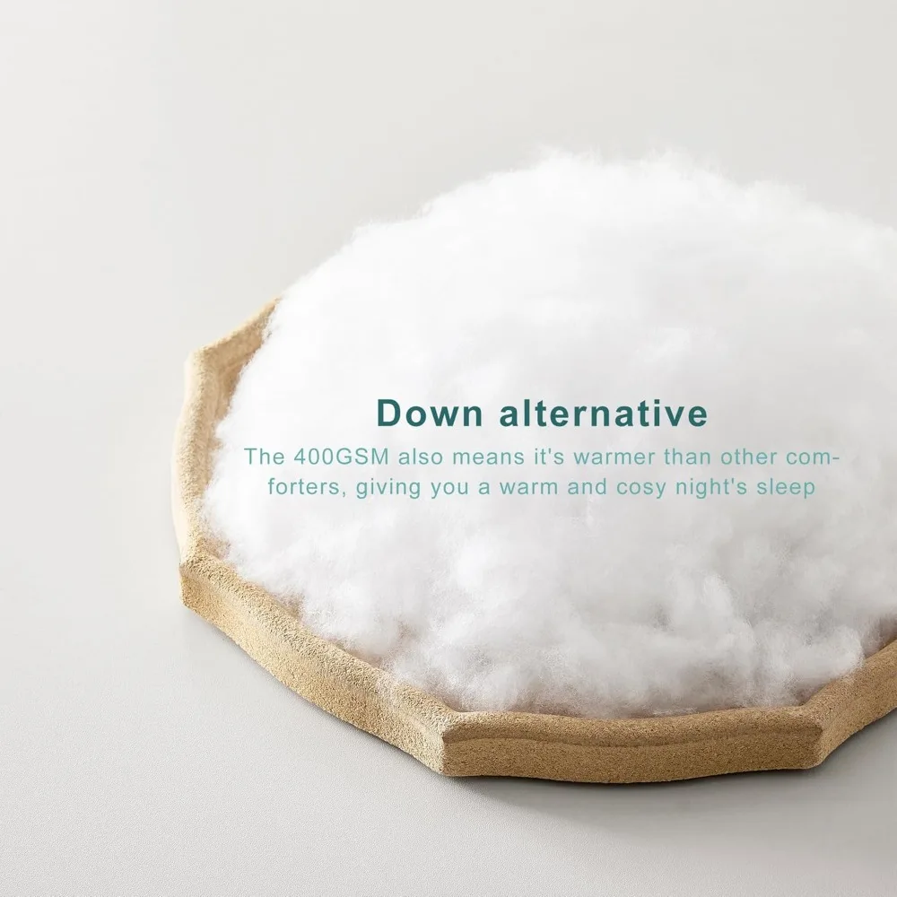 This comforter, made by Accuratex, is filled with premium 400GSM 0.9D microfiber, providing a fluffy and cozy feel. Its 400GSM rating ensures it retains more warmth compared to other comforters, making it ideal for cold winter nights. Suitable for bedrooms, guest rooms, or hotel bedding, it's a versatile choice. Our bedding duvet insert cover is crafted from 100% cotton, which is breathable, soft, and moisture-wicking, promoting a dry and comfortable sleep. The materials are OEKO-TEX certified, hypoallergenic, and free from irritants, giving you peace of mind when purchasing. The comforter features a box-stitch design that keeps the filling evenly distributed, preventing any leakage or tearing. The piping on the edges further enhances its durability. With four corner tabs, this comforter can be easily used as a duvet insert with your preferred comforter cover. The tabs are convenient for attaching and securing the duvet insert, preventing it from sliding around. For care, the comforter is machine washable on a gentle cycle with cold water and can be tumble dried on low heat. After unpacking, shake and pat it gently to restore its fluffiness. It's recommended to use a comforter cover to extend the life of the duvet insert and avoid high temperatures.