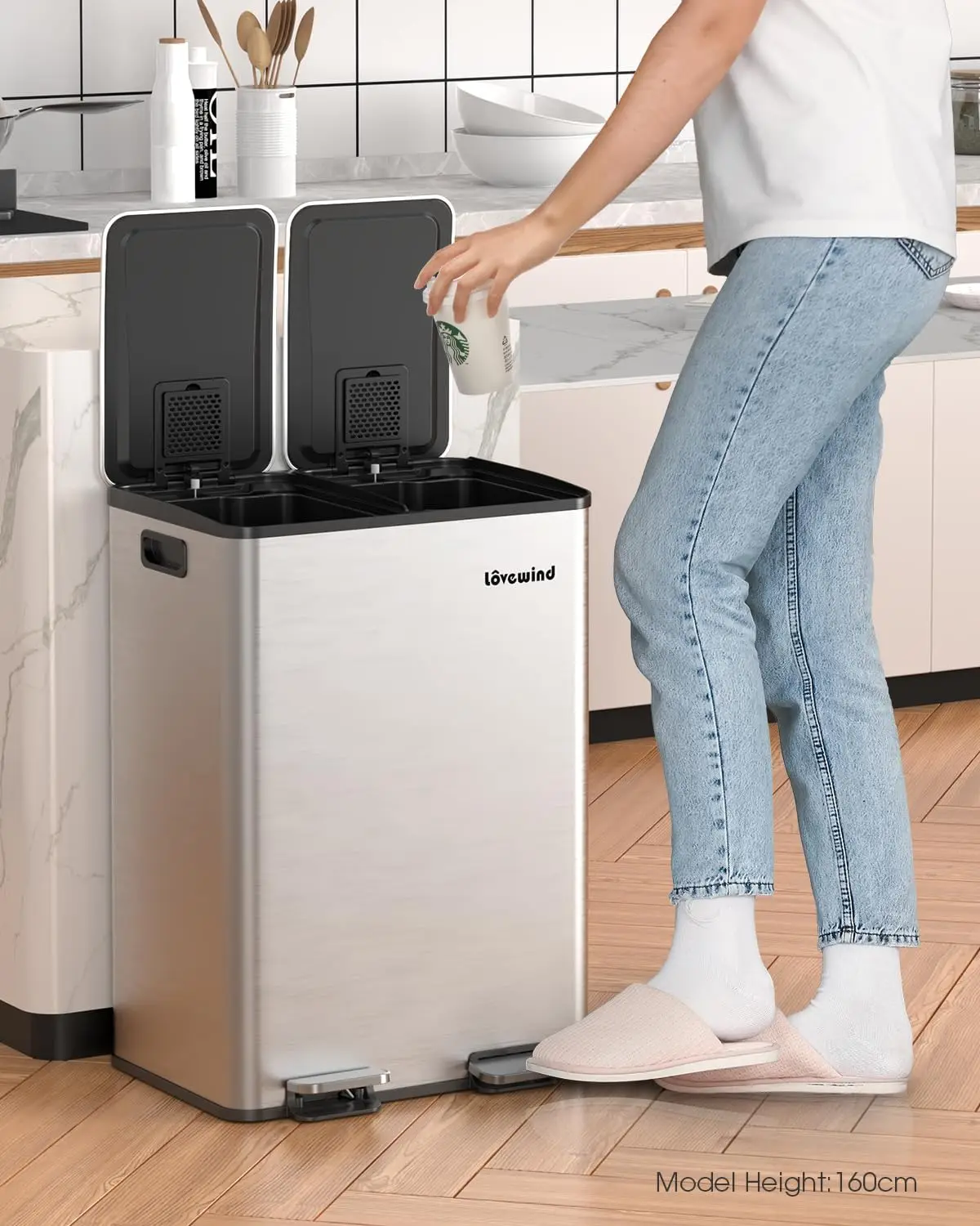 - Dual Compartment Design: Lovewind stainless steel pedal trash can features 2 x 8-gallon removable buckets, which can hold a total of 16 gallons of trash, ideal for waste sorting and recycling at home or in the office