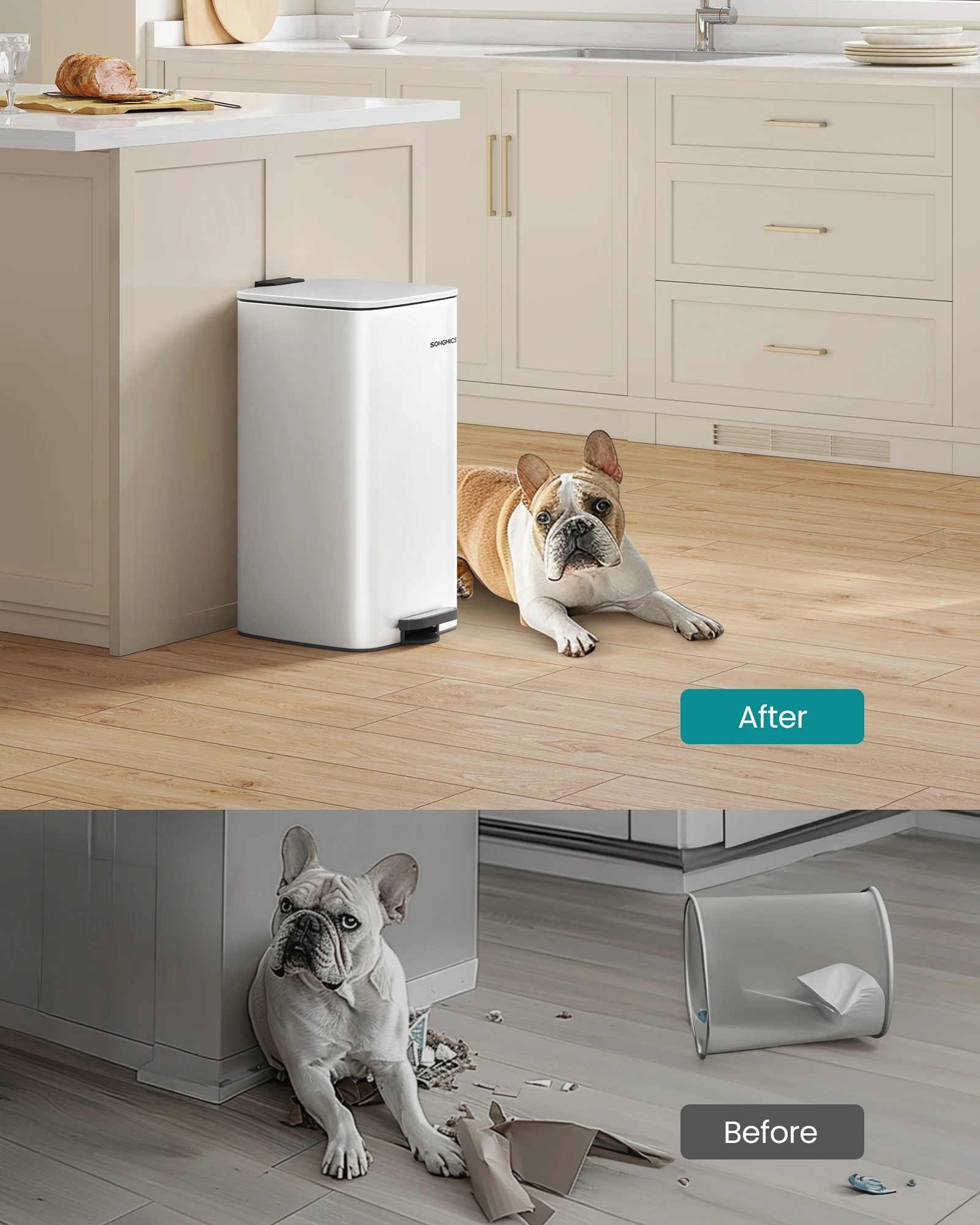 【ENHANCED STABILITY】This trash bin is equipped with non-slip pads at the base to enhance its stability, deterring pets from knocking it over and helping to keep your space tidy