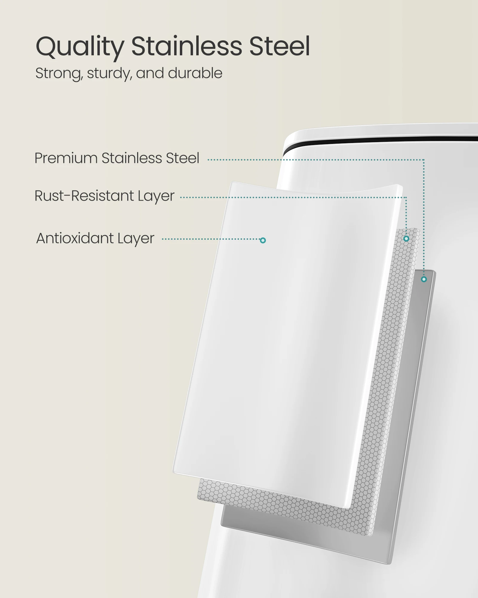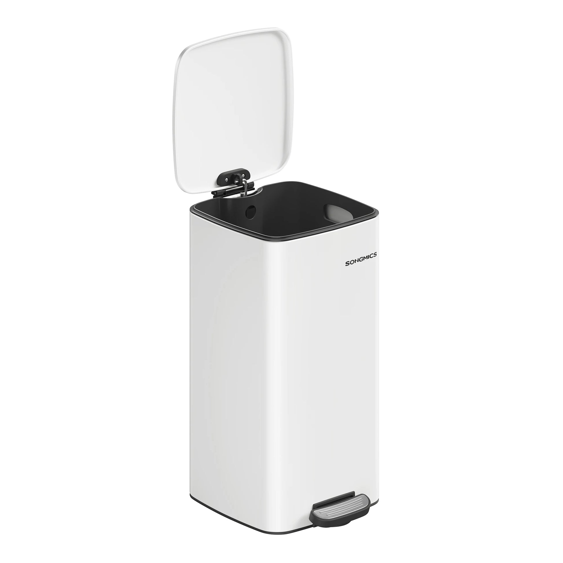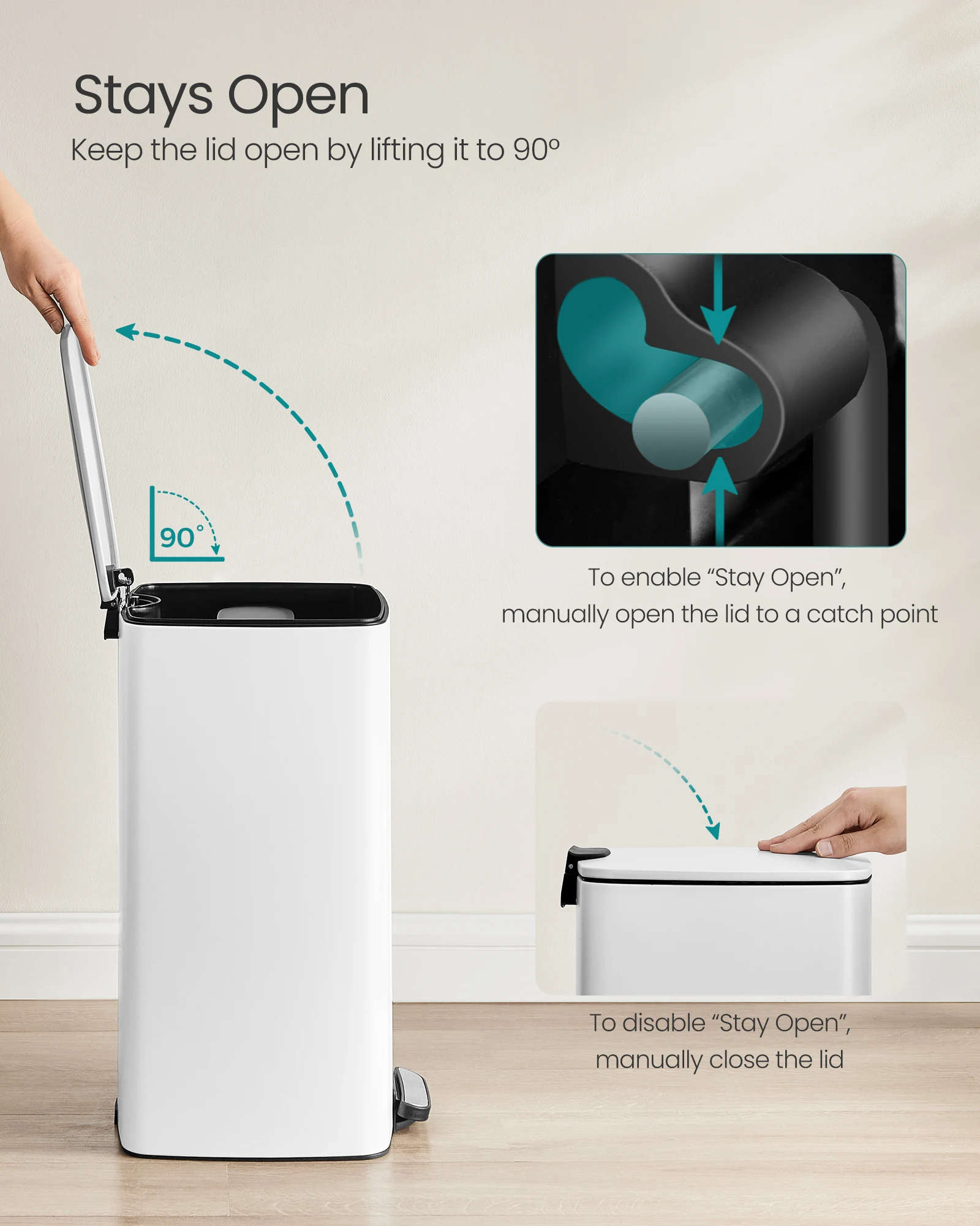 【SOFT-CLOSE & STAY-OPEN】This garbage can features a lid that closes quietly and gently without slamming shut. Additionally, you can keep the lid open by manually open it to 90° for easy waste disposal when needed