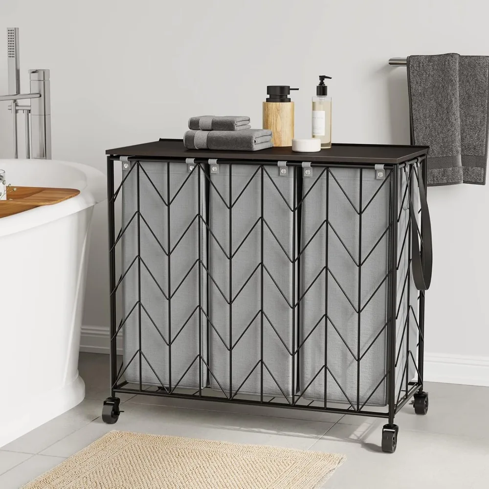 This laundry basket features a sturdy iron wire frame with a detachable canvas liner, perfect for holding a variety of items such as clothes, towels, and blankets. Its sleek design complements any home decor and is versatile for use in bedrooms, bathrooms, or laundry rooms. The top wooden lid offers additional support and storage space for laundry supplies or decorative items, while also protecting the contents from dust. With three large-capacity bags, each holding 47 liters for a total of 142 liters, this basket helps organize laundry by color and material, saving time and effort. The basket is equipped with removable liner bags for easy transport to the washer and smooth-rolling wheels with brakes for convenient room-to-room movement. Assembly is straightforward with clear instructions and numbered parts, ensuring a hassle-free setup.
