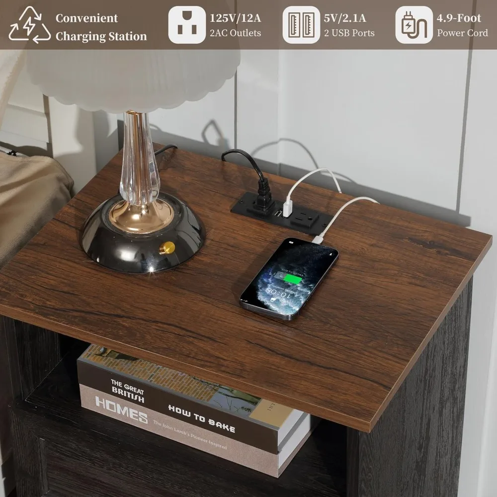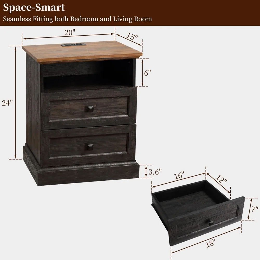 Night Stand Set of 2 with Charging Station, Bedside Table with 2 Drawers Storage and Open Shelf, Wood Farmhouse Nightstands