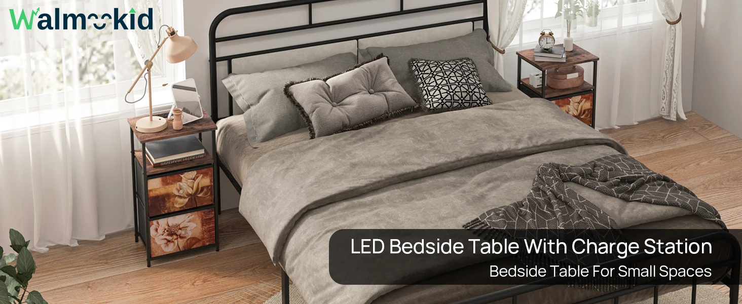 nightstand Set of 2 with Charging Station, LED Bedside Table w/USB Ports & Outlets,End Table w/2 Fabric Drawers and Open Shelf