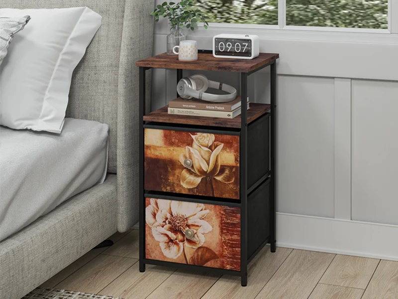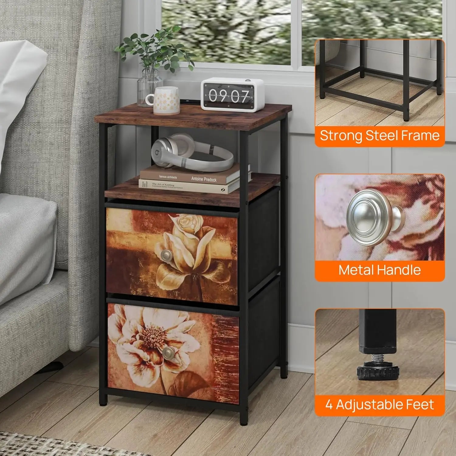 1. ⚒️【𝐒𝐓𝐔𝐑𝐃𝐘&𝐃𝐔𝐑𝐀𝐁𝐋𝐄 𝐌𝐀𝐓𝐄𝐑𝐈𝐀𝐋】The retro-style bedside table with drawers is made of high-quality materials, blending non-woven fabric and black metal frame to create an elegant atmosphere in your home while ensuring longevity and reliability for daily use. Wearing adjustable feet will protect your floor from scratches and ensure stability on uneven surfaces.
