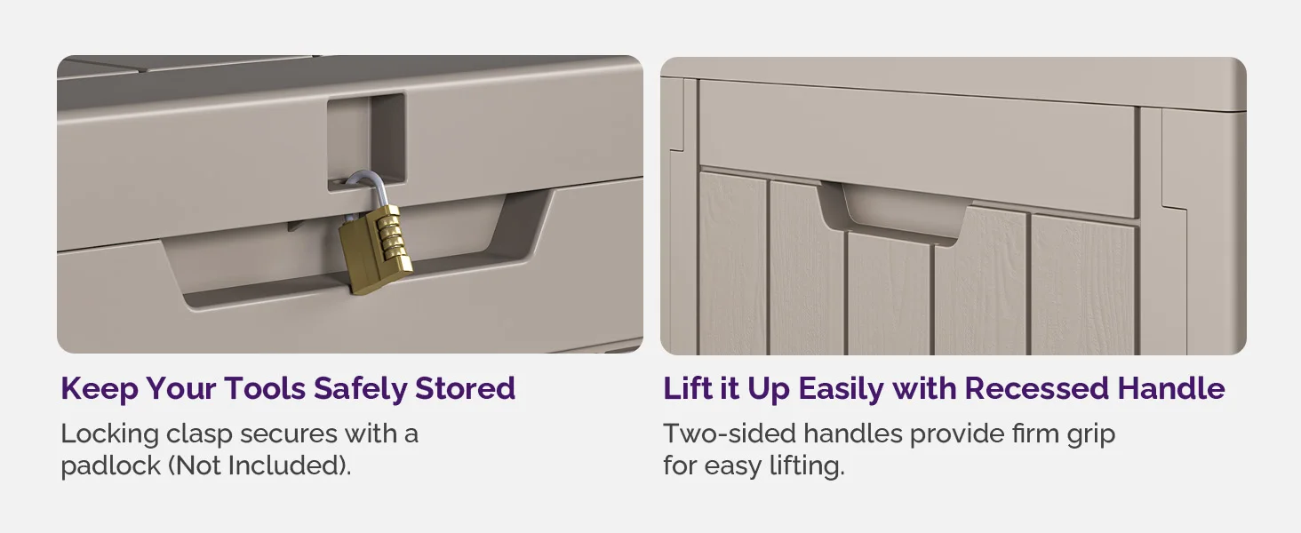 GRAB-AND-GO CONVENIENCE: With built-in handles on both sides, our deck boxes outdoor waterproof ensures easy grabbing and moving. Add an extra layer of security by installing a password lock/small lock (not included) on the top cover
