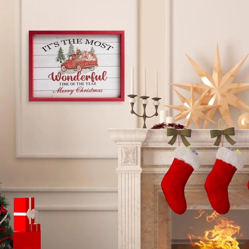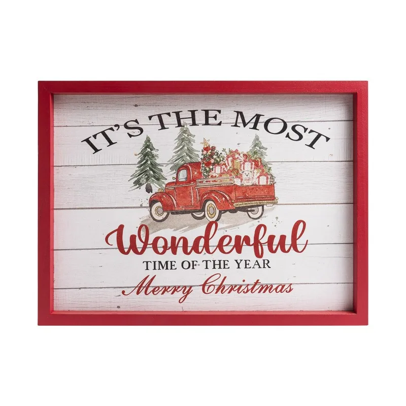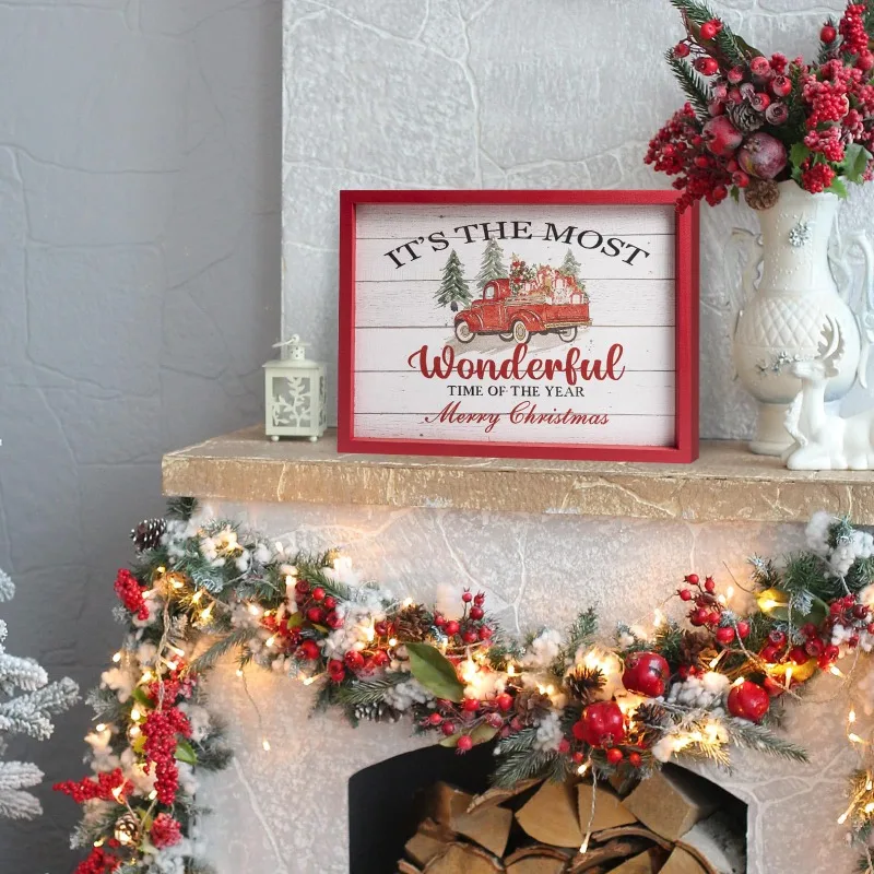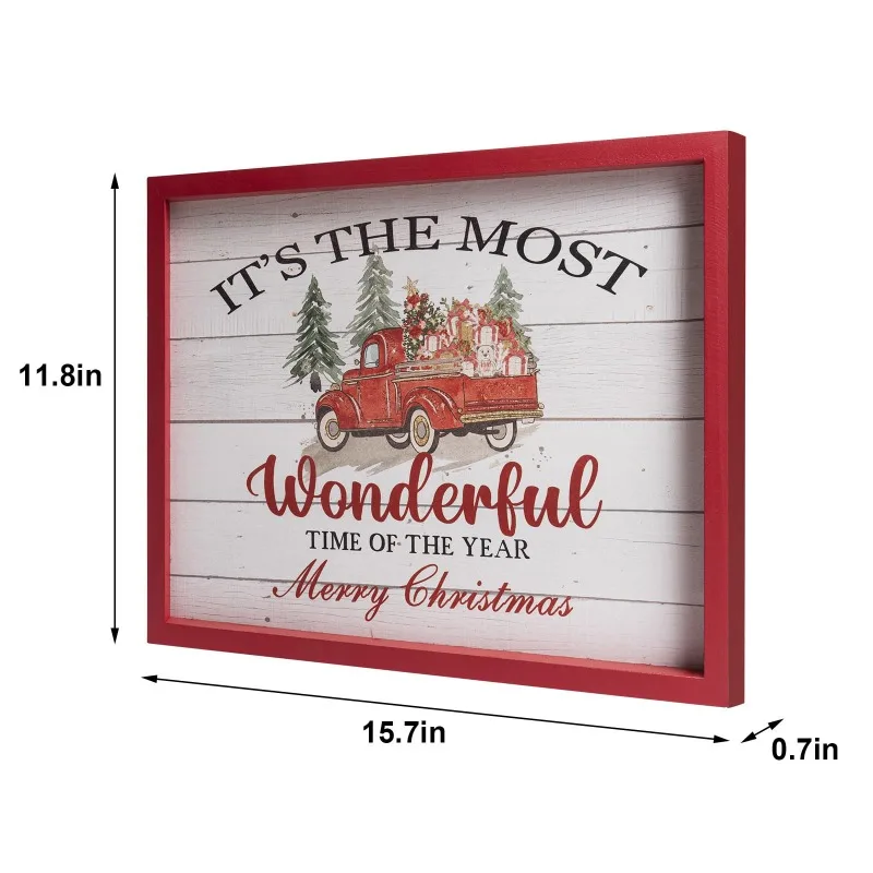 Red Truck Christmas Wall Decor, Wooden Its The Most Wonderful Time Of The Year Sign, Rustic Holiday Wall Art Framed Home