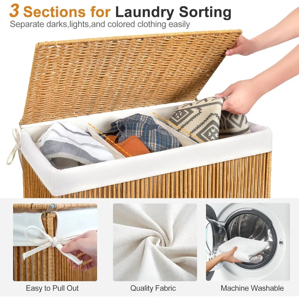 This laundry hamper features a stylish design with a thickened iron wire frame and a breathable, waterproof PP rattan that is hand-woven, creating a versatile look suitable for any home decor. It's perfect for use in bedrooms, bathrooms, or laundry rooms. The basket comes with a removable liner bag for easy assembly and machine washing. Equipped with four 360° wheels, including two with locking functions, it can be easily stabilized when not in motion. The three-compartment design allows you to separate laundry as needed, such as dark from light clothes or large from small items. A lightweight lid is included to keep odors contained and protect clothes from dust, helping to maintain a tidy home. The hamper measures 28.4 x 13 x 26.4 inches (L x W x H) and has a capacity of approximately 150 liters, making it spacious enough for a week's worth of laundry for the whole family. Its foldable design also makes it easy to store when not in use.