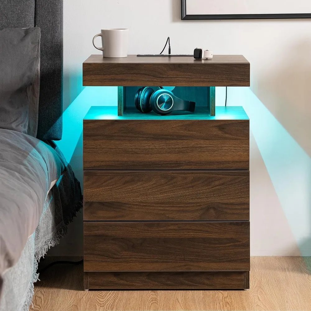 Rustic Brown Nightstand with Wireless Charging Station Walnut Wood LED Bedside Table with 3 Drawers End Table Smart Night Stand