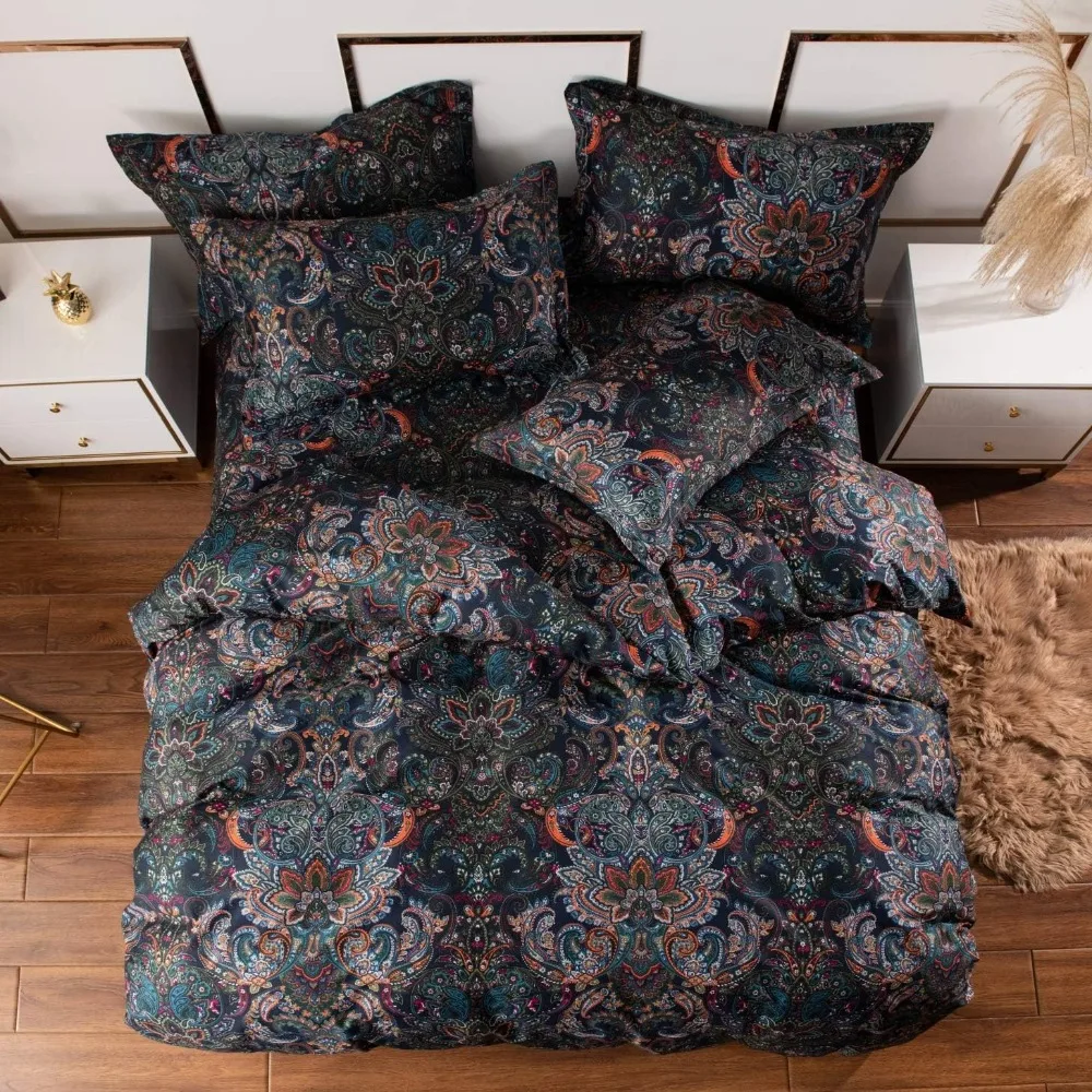 This product is a king size quilt cover set that includes one quilt cover measuring 106 inches by 92 inches and two pillowcases/covers each measuring 20 inches by 36 inches. It is important to note that this bedding set does not come with any comforter or filling, and it does not include any sheet sets. The design features a calming and elegant black color with a vintage paisley pattern, which exudes a sense of luxury and stability. The patterns are rich in color and not dull, making the bedroom a serene space where one can relax quickly. The bedding is crafted from high-quality brushed cotton, ensuring comfort, durability, and an attractive appearance. Maintenance is hassle-free as the set can be machine washed in cold water and tumble dried on a low setting. Avoid soaking for extended periods and refrain from dry cleaning. This bedding set is not only convenient to transport but also makes for an ideal gift for loved ones such as mothers, fathers, and children.