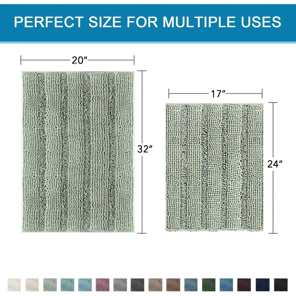 Sage Bathroom Rugs, Bath Mat Set of 2 Extra Thick Chenille Striped Pattern Shaggy Bath Rugs for Bath Room, Non Skid