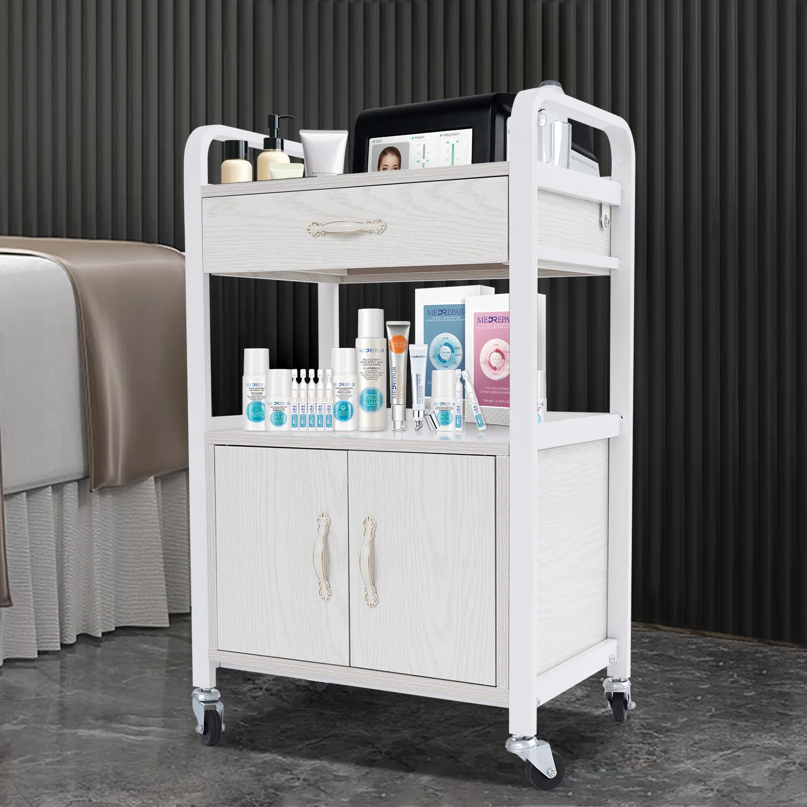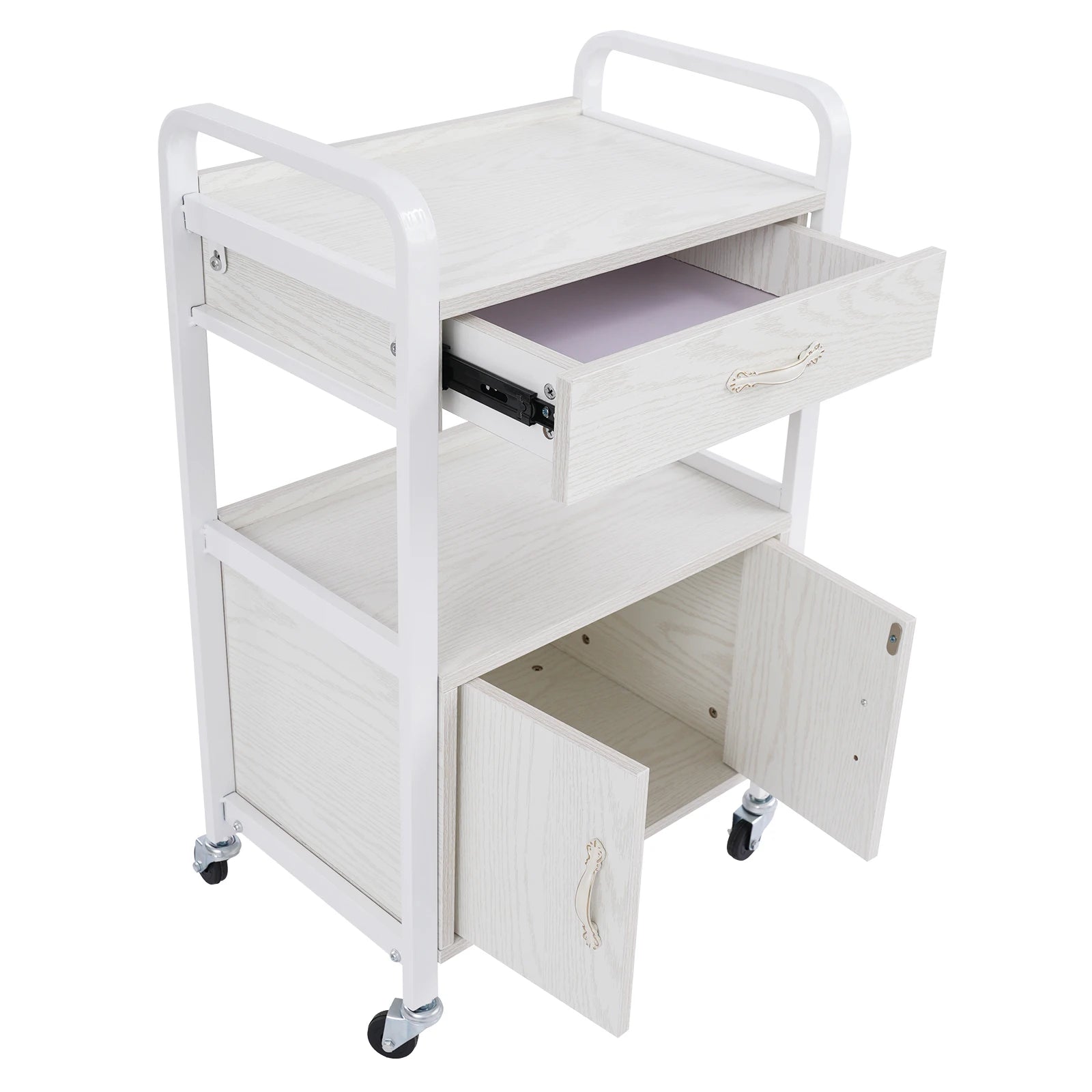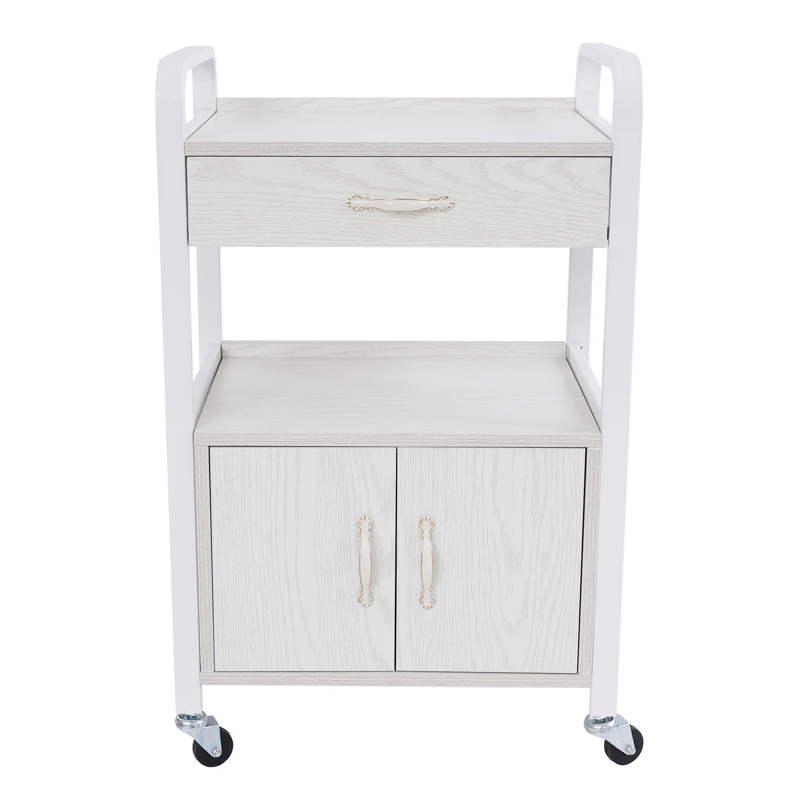 Salon High-density Wood Panels Storage Cart,White Rectangle Free Standing Movable Beauty Organizer