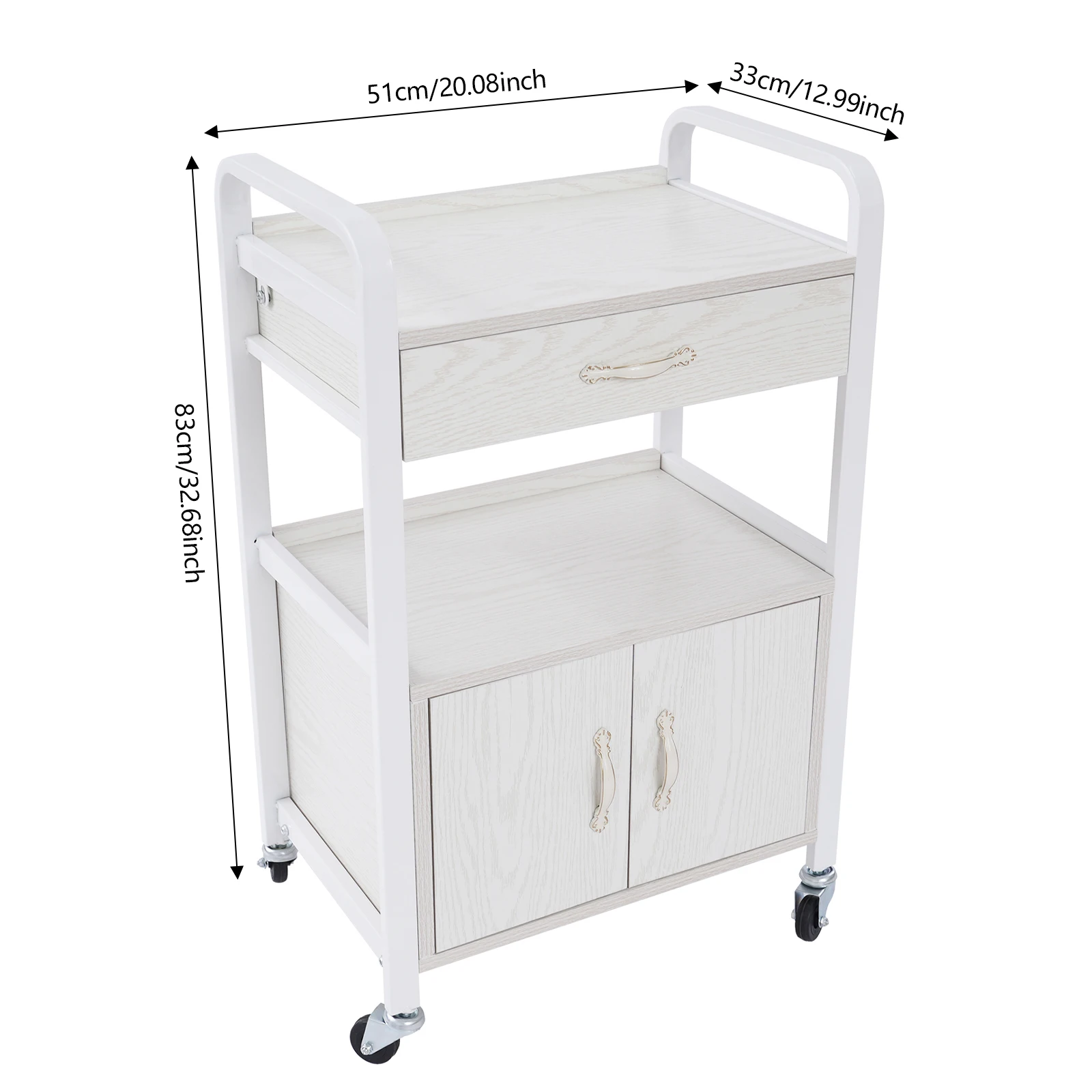 Adequate Storage Space: It includes a drawer, a storage cabinet, and 2 tiers of shelving boards in the middle and top to provide you with enough space for your beauty tools and make your work environment more organized.