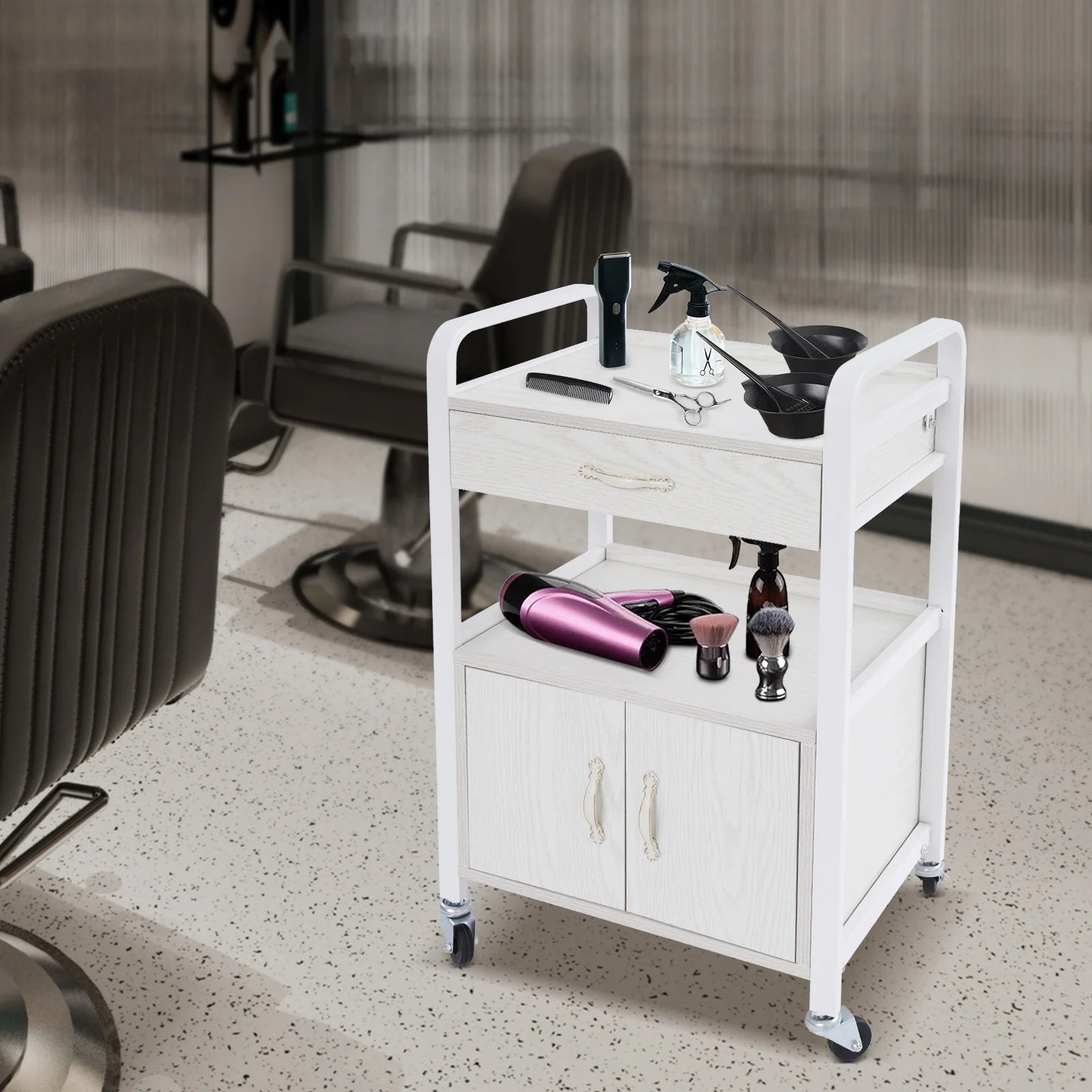 It is suitable for beauty salons, barber shops, nail salons, offices, living rooms, bedrooms, kitchens, manicure shops, spas, and other places. It can be used to store beauty and hairdressing tools, kitchen supplies, cosmetics, skincare products, etc.