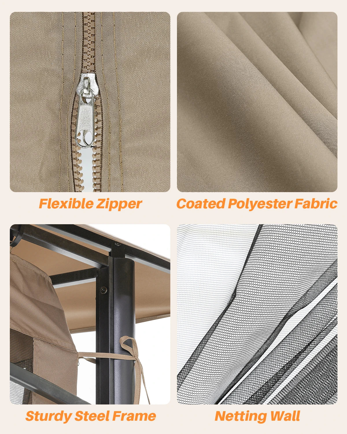 All-Season Functionality & Elegant Finish: With built-in ceiling hooks for lights or fans and a neutral Sand Khaki top that pairs effortlessly with natural surroundings, this gazebo elevates every outdoor occasion—from backyard BBQs to evening garden receptions.